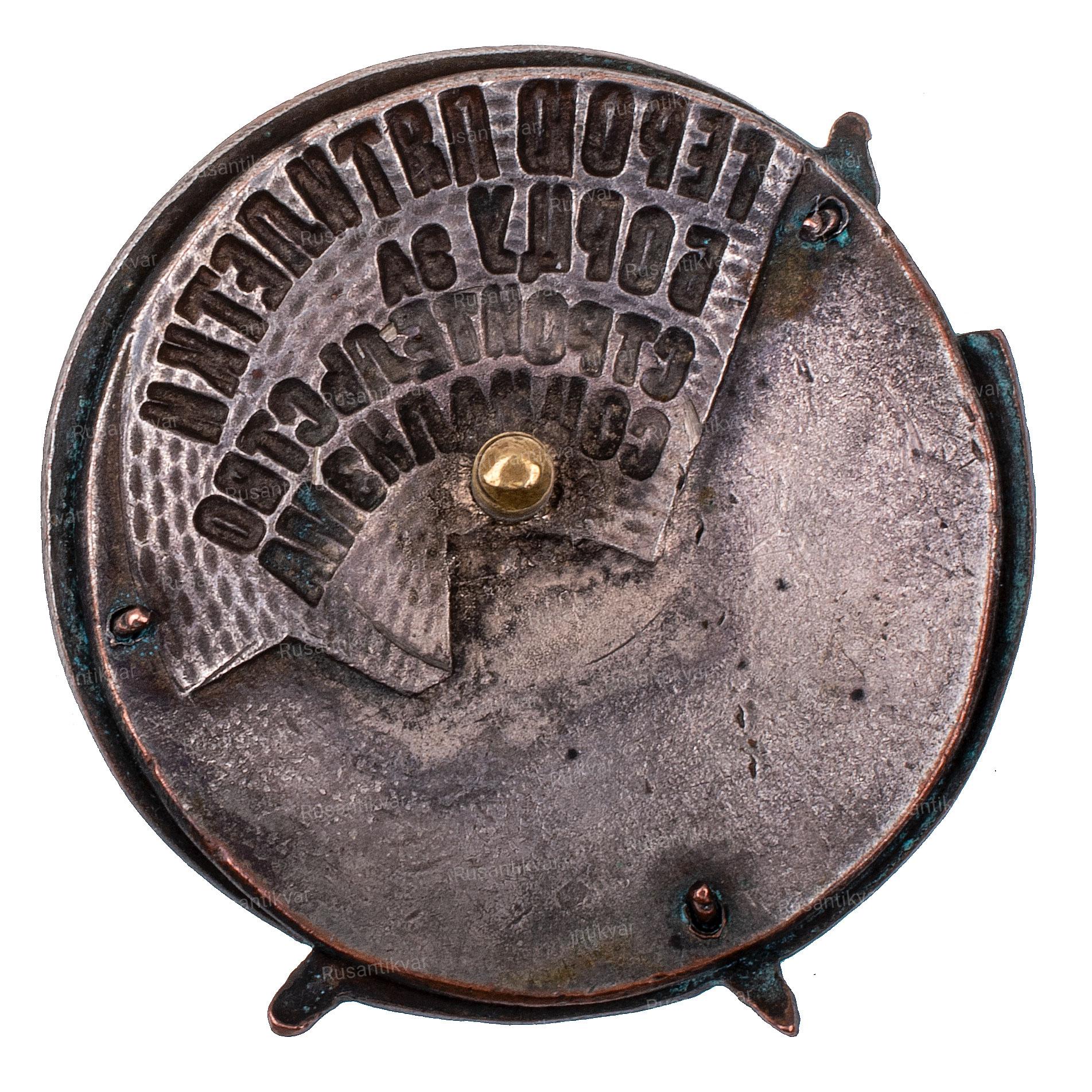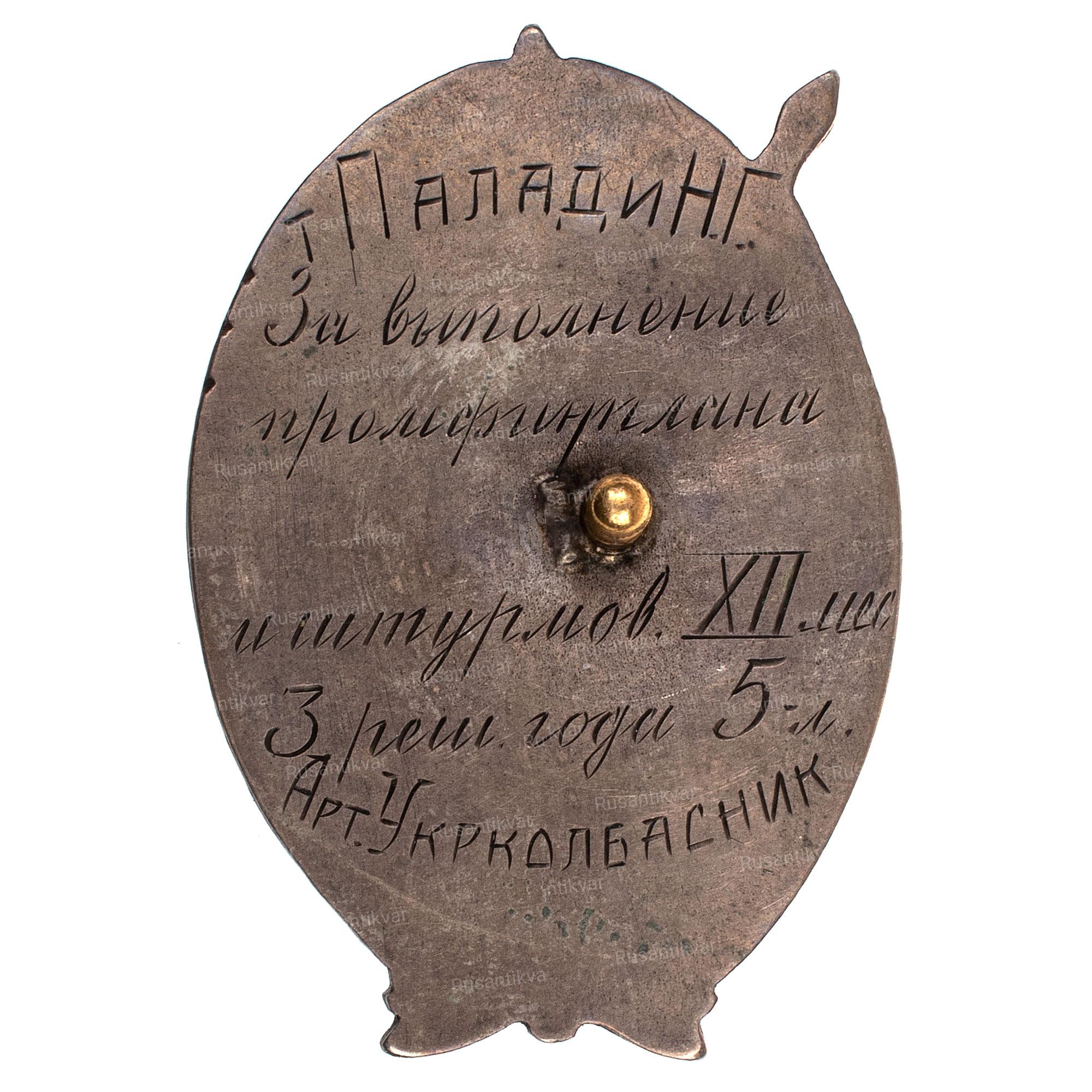 На реверсе надпись штихелем:"т.Палади Н.Г. за выполнение промфинплана и штурмов. XII мес 3 реш.года 5-л.Арт.Укрколбасник"