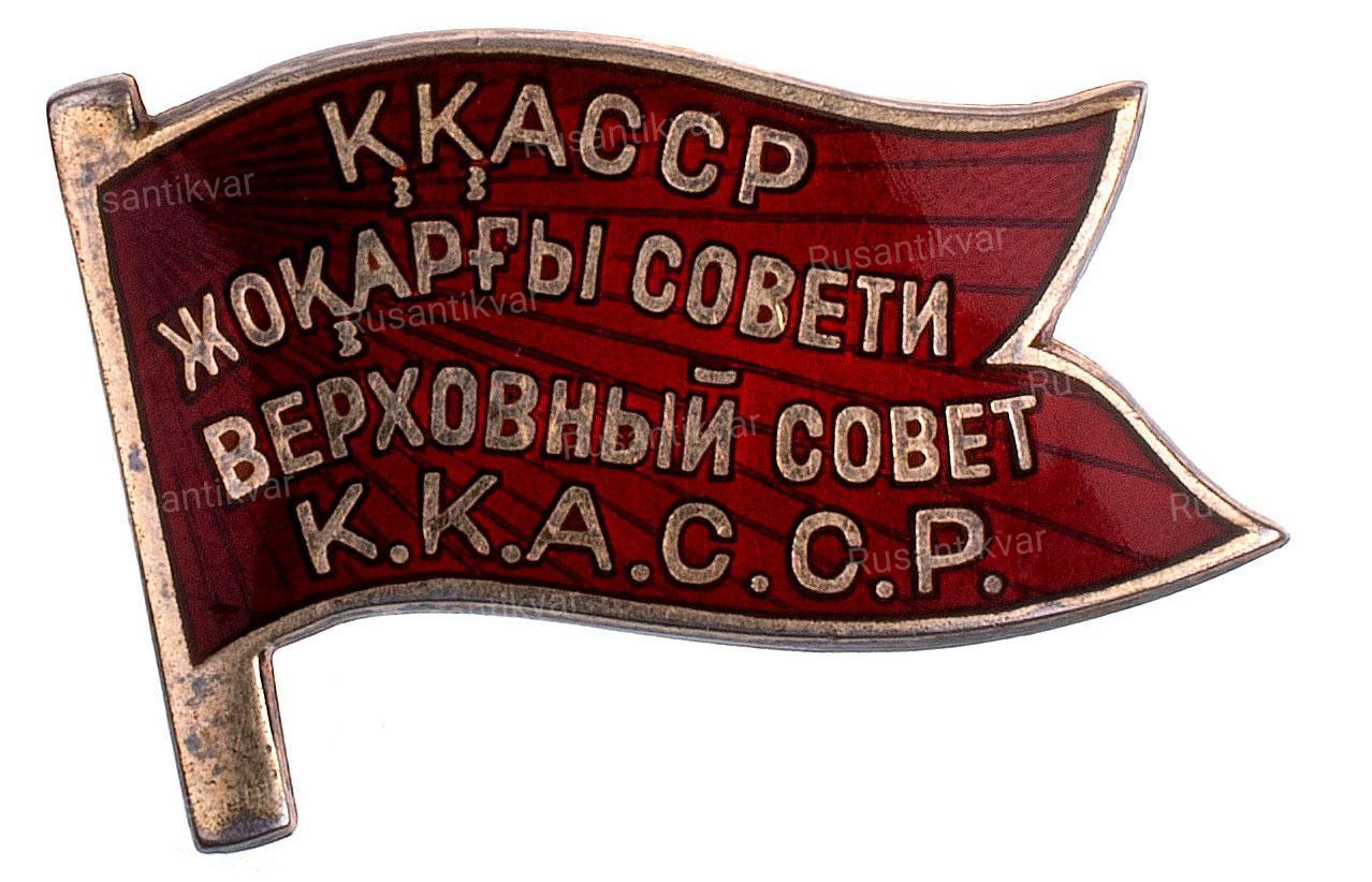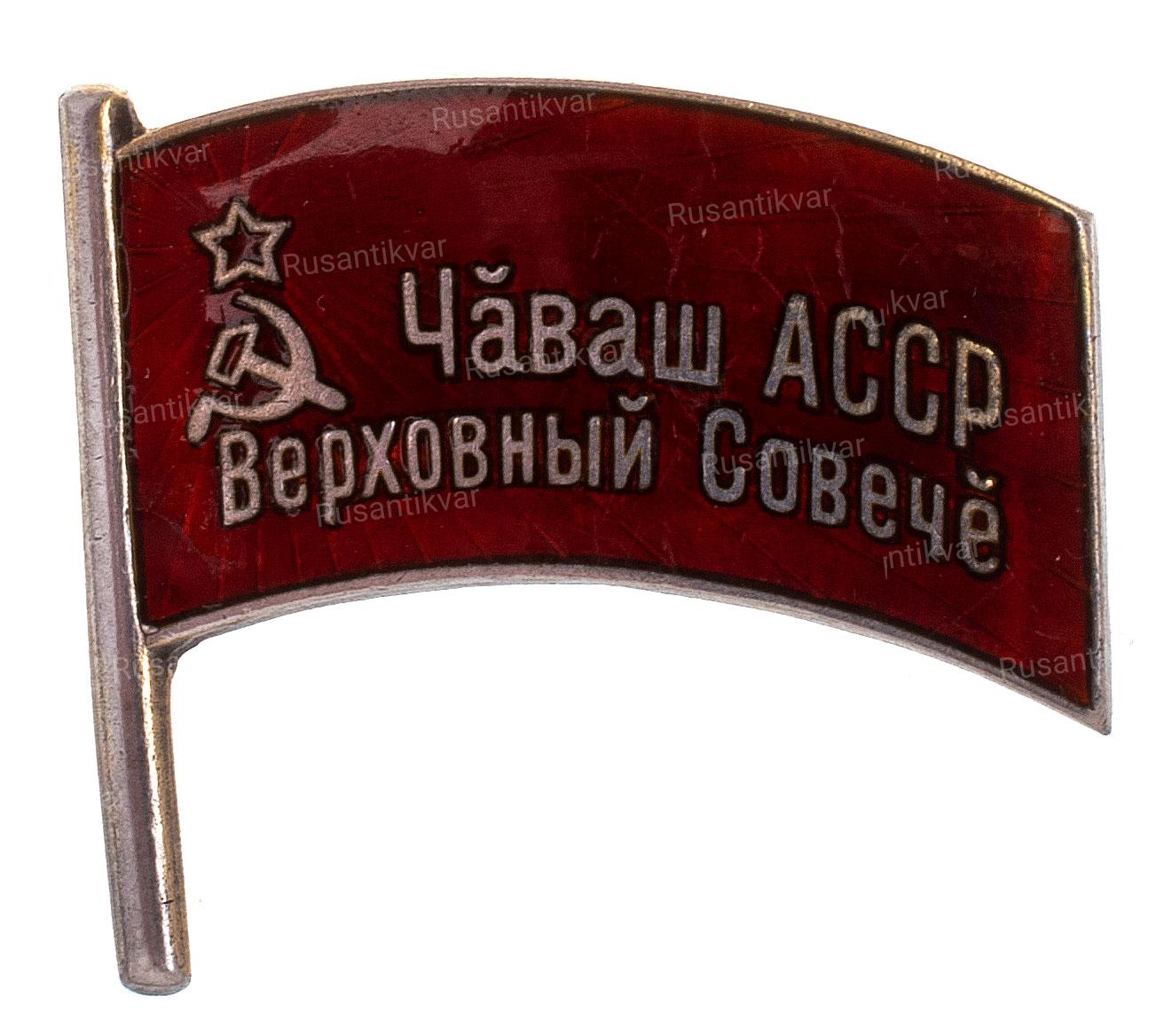 Московский Монетный двор, 1947 - 1951 гг. Серебро, позолота, эмаль, 7,2 гр. Размеры 24,01 х 17,56 мм. На оборотной стороне знака штихелем вырезан номер "199" и пуансоном выбиты буквы "МД". Крепление винтовое. Сохранность отличная (UNC). Мехоношин А. И. "Нагрудные Знаки. Высшие органы власти 1917 - 1991" № 24.2.2. Довольно редкий (Р). Выдано 812 знаков.