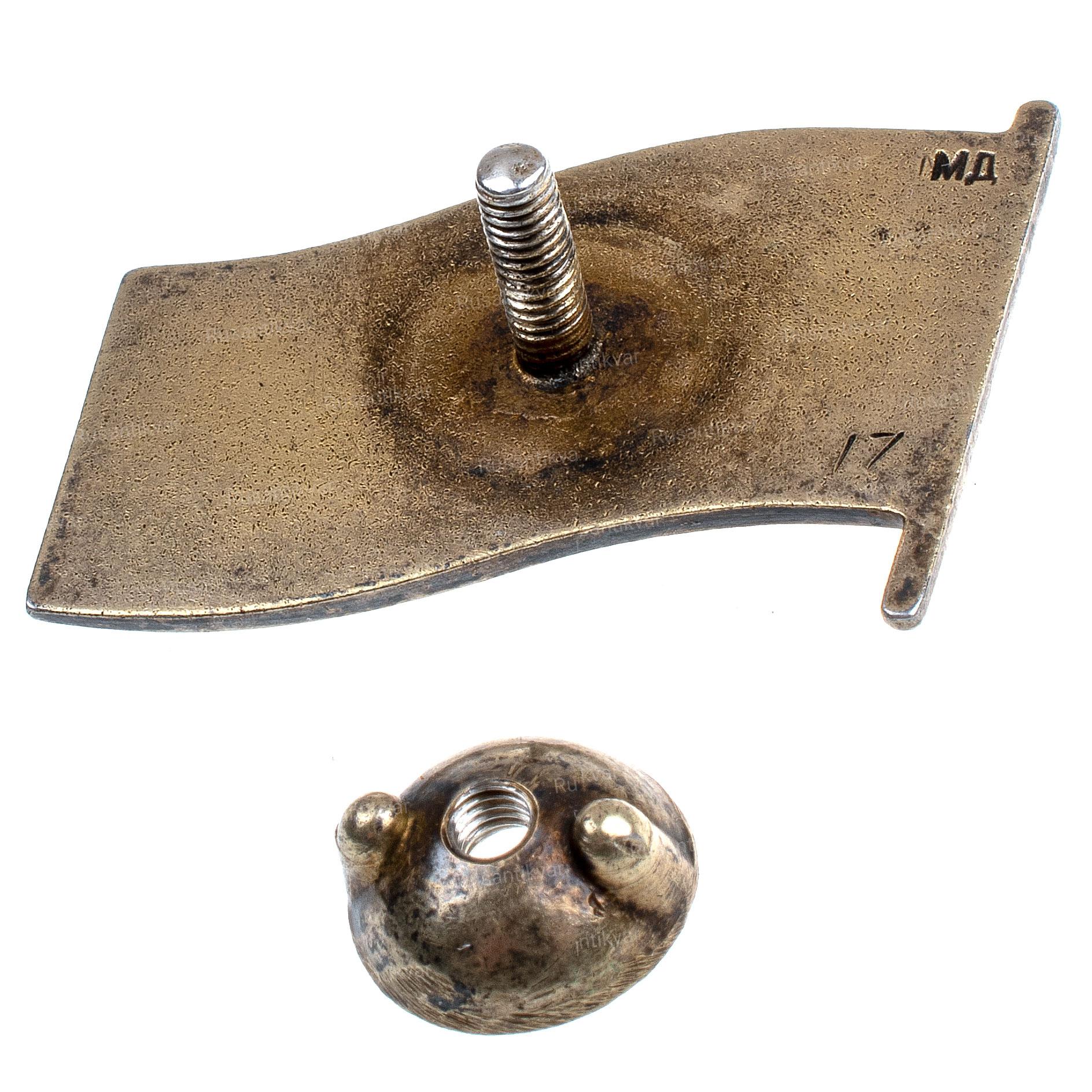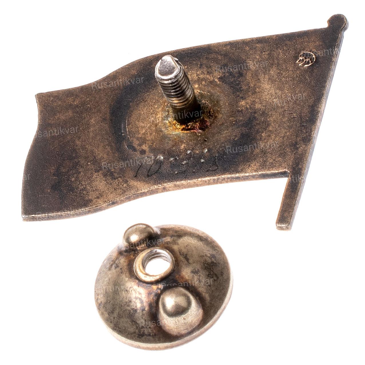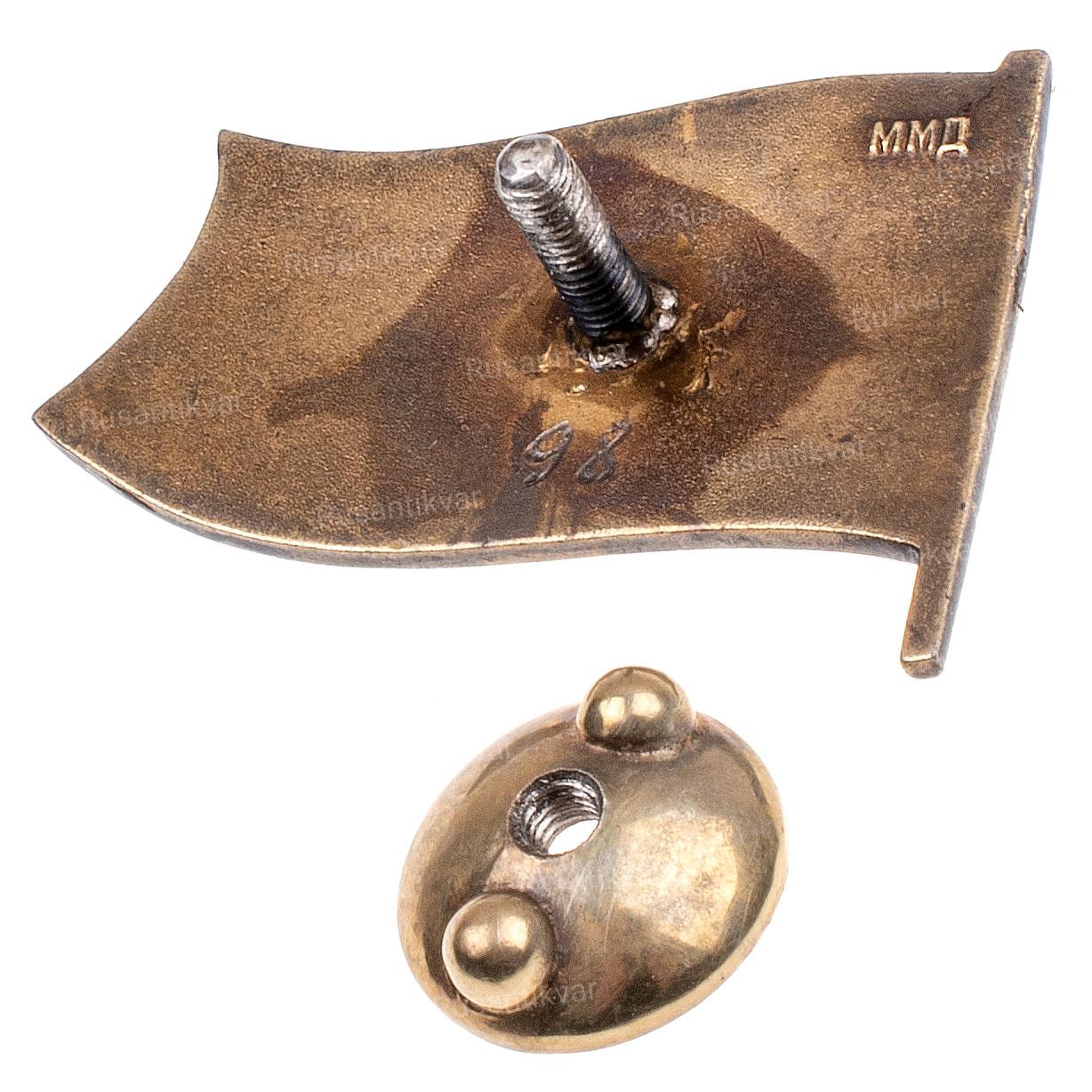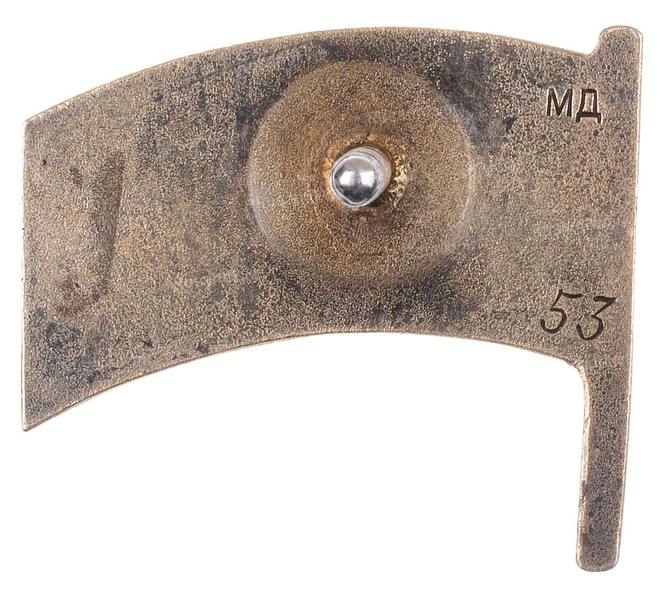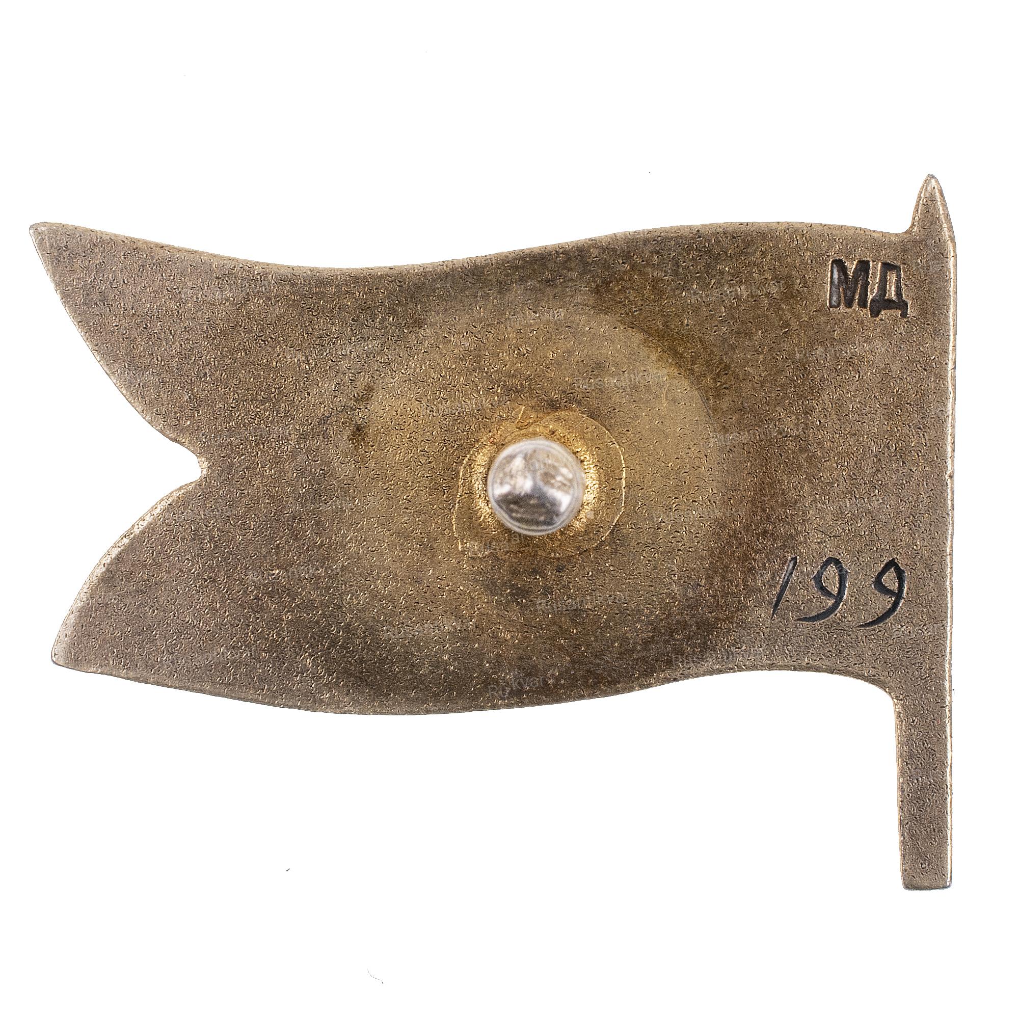 1938 г. Ленинградский монетный двор. На оборотной стороне: клеймо «МД», номер «157». Серебро, эмаль. Размер 28,4×31,4 мм. Вес 11,57 г. Мехоношин, № 16.2.1. Редкость 4.