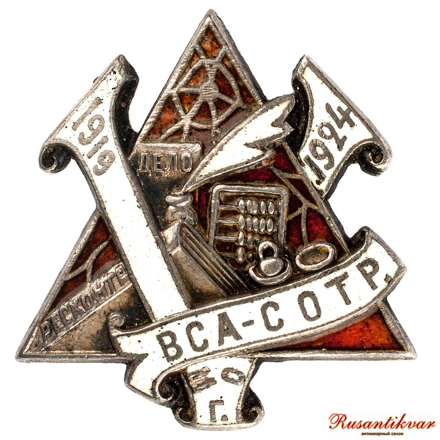 Юбилейный знак " 5-летие Московского отделения Всероссийского союза работников административно-советских, общественных и торговых учреждений и предприятий (ВСА-СОТР) " 1924 г.