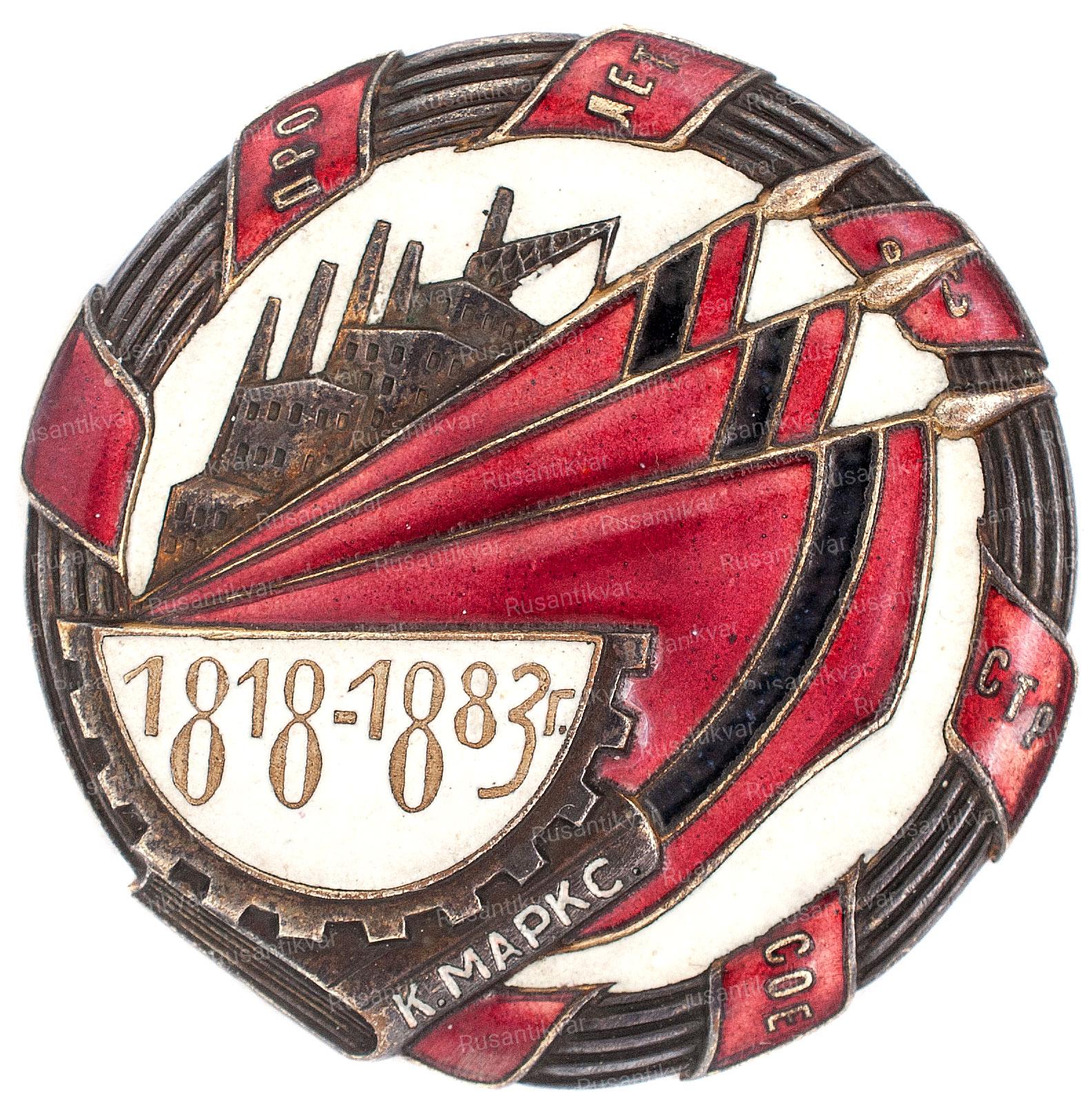 Знак сложной круглой формы.В центре-слева фабричное здание,справа-красные знамена с траурной лентой.Слева внизу на белом фоне дата"1818-1883,под ними "К.Маркс".Значок обрамлен витком ленты,на которой видны слоги лозунга "Пролетарии всех стран,соединяйтесь!"-"Про/лет/вс/стр/сое".