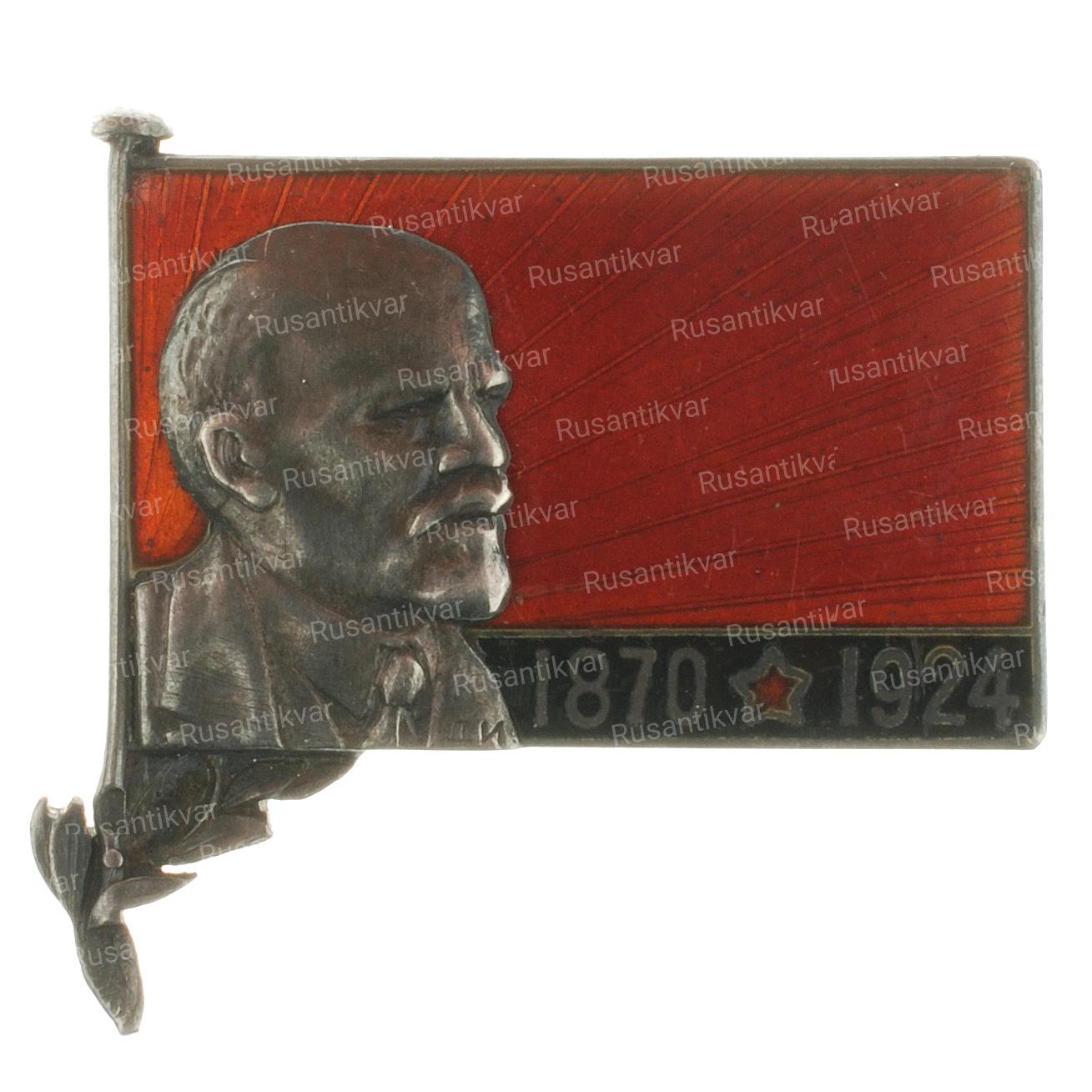 СССР, Ленинград, 1924 г. Неизвестная мастерская. Портрет Ленина работы гравера Д.И (инициалы на лацкане пиджака). Клейма слева внизу на листьях — Ленинградского окружного пробирного управления в овальном щитке [альфа, женская головка в кокошнике, вправо, 84]. Серебро, эмаль, 11.6 гр. Размеры 31×34 мм. Крепление - горизонтальная булавка с застежкой.
