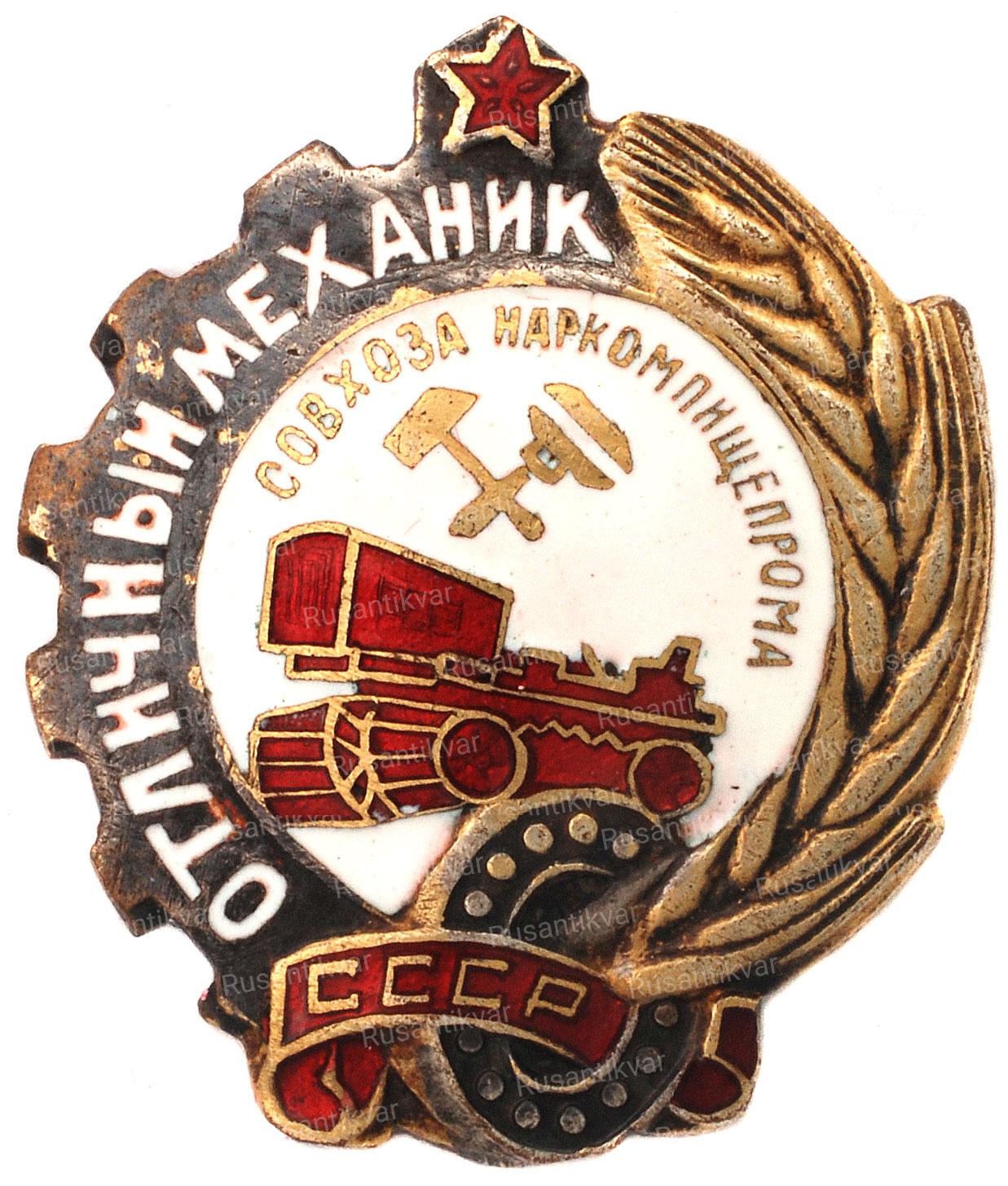 Знак "Отличный механик совхоза Наркомпищепрома СССР" 1940-е г.