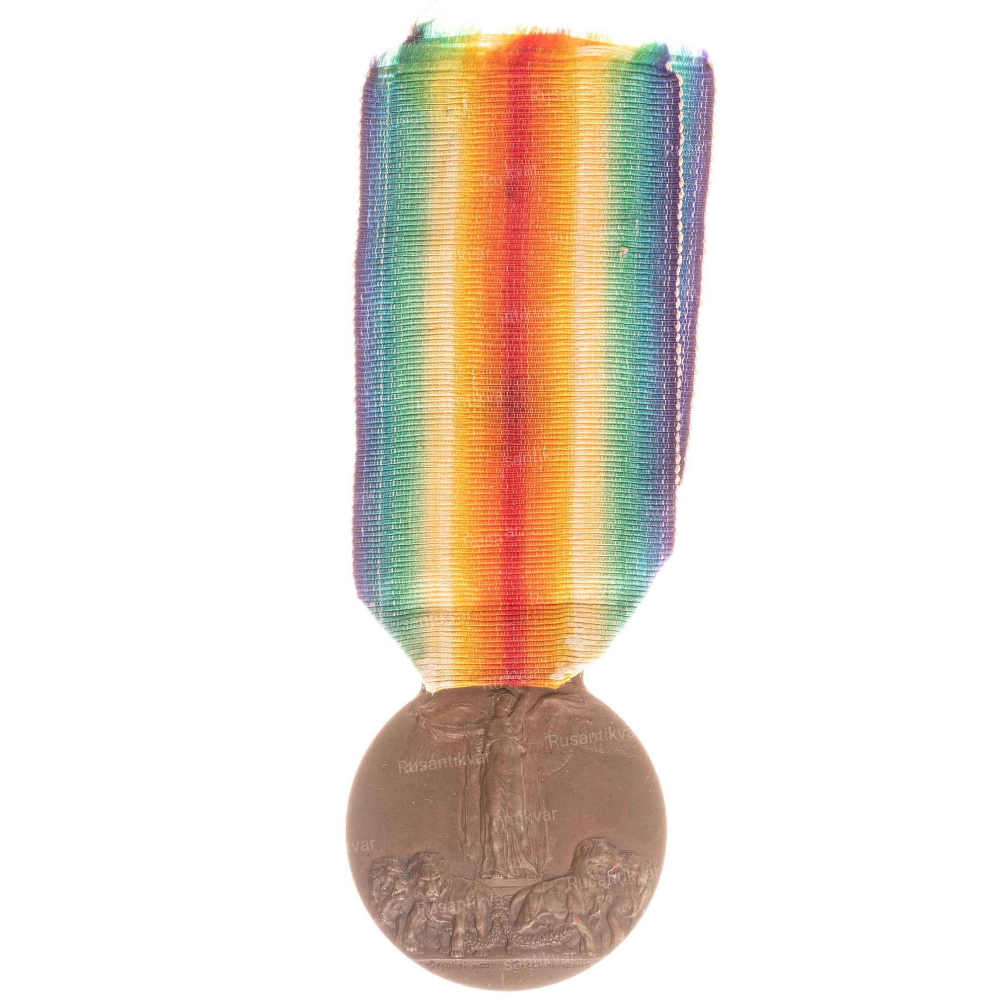 По предложению французского Маршала Фоша (возглавлял на Западном фронте все силы союзников, годы жизни 1851 - 1929 гг ), страны Антанты решили в честь победы выпустить специальную медаль для всех принимавших участие в военных действиях военнослужащих и гражданских лиц. На аверсе должно быть помещено изображение крылатой богини Победы, а на оборотной стороне надпись "Великая война во имя защиты цивилизации". Медали должны быть выполнены из бронзы, диаметром 36 мм и иметь ленту цветов радуги. Официально медаль выпустили 14 государств: Бельгия (350 тыс), Бразилия (2.5 тыс), Великобритания (6 млн), Греция (50 тыс), Италия (2 млн), Куба (7 тыс), Португалия (100 тыс), Румыния (300 тыс), Сиам (Тайланд) (1.5 тыс), США (2.5 млн), Франция (2 млн), Чехословакия (90 тыс), Южная Африка (75 тыс) и Япония (700 тыс). На оборотной стороне, кроме согласованной надписи, многие страны поместили собственную символику, символику остальных стран - победительниц или их перечень.