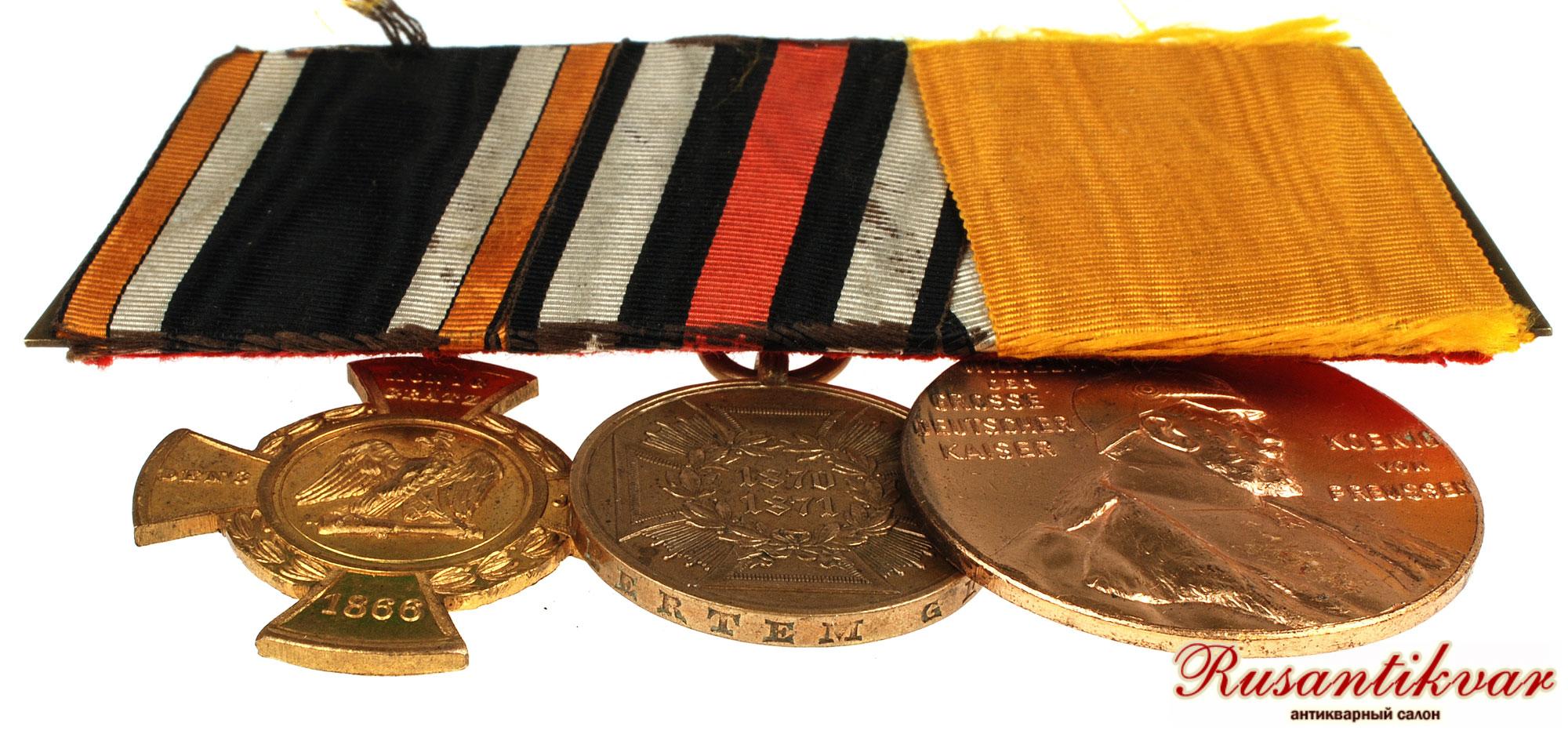 2. Памятная военная медаль за кампании 1870-1871 гг. учреждена 20.05.1871 г. кайзером и королем Пруссии Вильгельмом I для награждения военнослужащих прусской и союзных армий, принимавших участие во франко-прусской войне (19.07.1870-10.05.1871), а также некомбатантов, включая женщин. В статуте награды особо оговаривалось, что медаль также вручалась экипажу и обслуживающему персоналу императорского корвета “Августа” (SMS Augusta), несшим службу с 11.12.1870 г. по 02.03.1871 г.