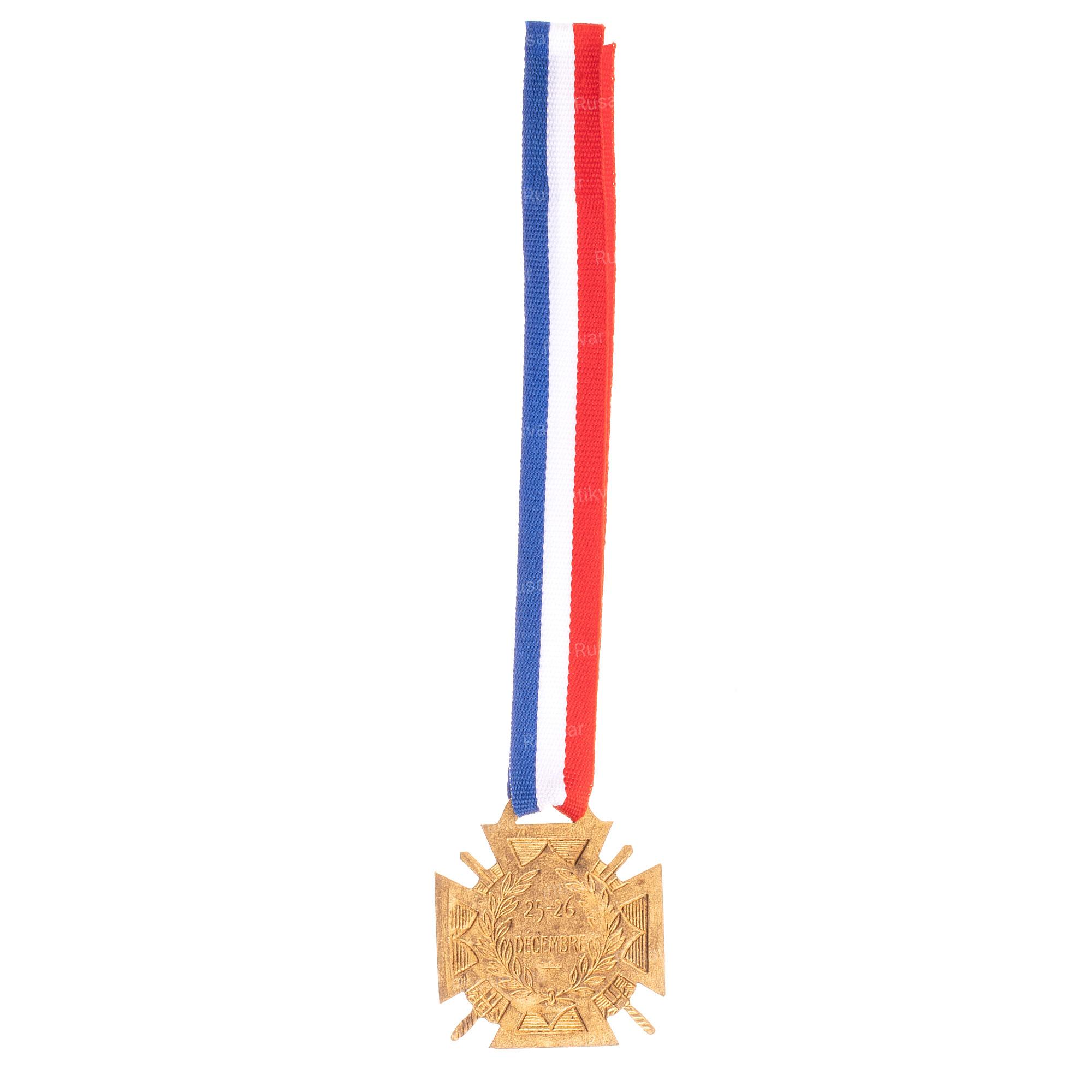 Аверс - Медаль За крест со скрещенными мечами. На центральном медальоне изображены солдаты в окопе, атакующие справа, а на переднем плане солдат играет на горне. Надпись на гербе Креста гласит: "JOURNEE DU POILU 1915" - "ПУТЕШЕСТВИЕ по ПОЛЮ 1915 г".