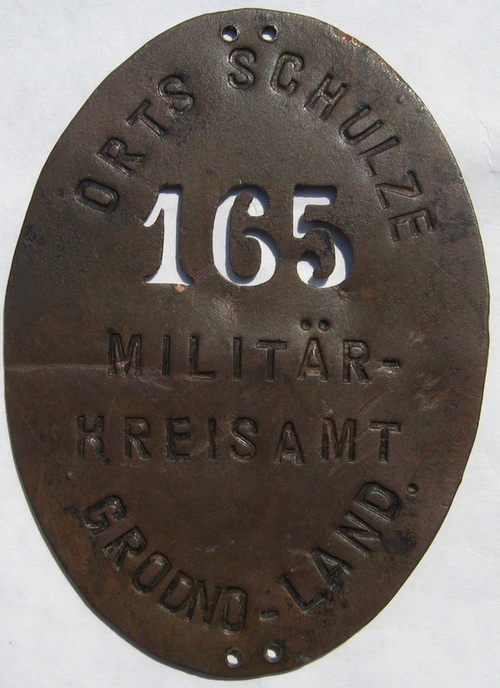 Должностной знак, возможно периода немецкой оккупации 1й или 2й мировой войны, надпись на немецком гласит примерно следующее: Местный староста военного окружного управления Гродненских земель.