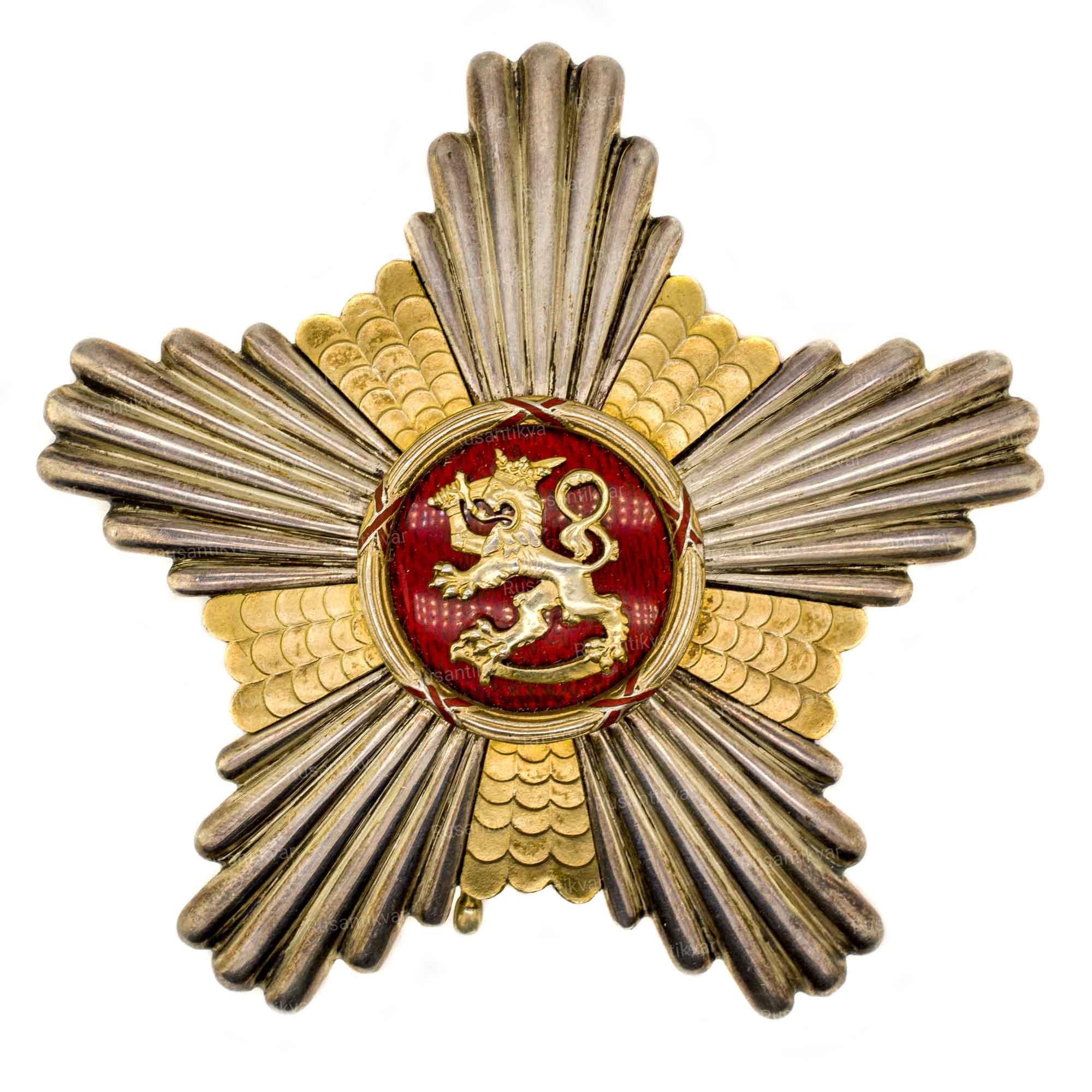 Серебряная пятиконечная звезда с позолоченными промежутками между лучами и позолоченным гербовым львом в центральном медальоне красной эмали.