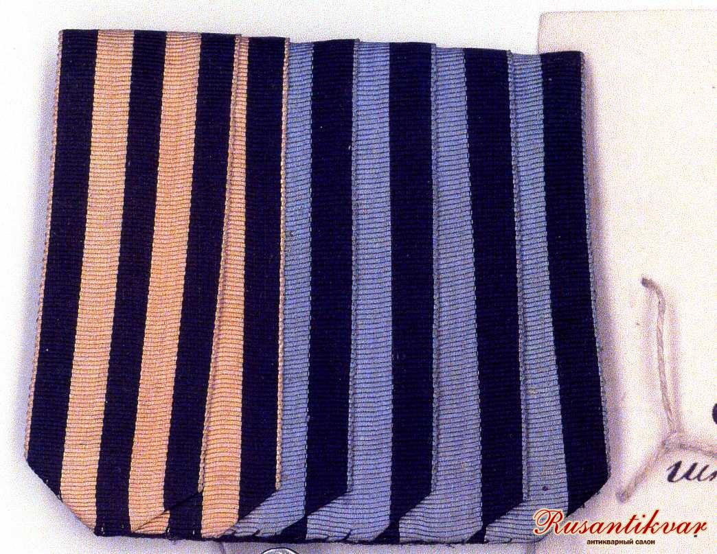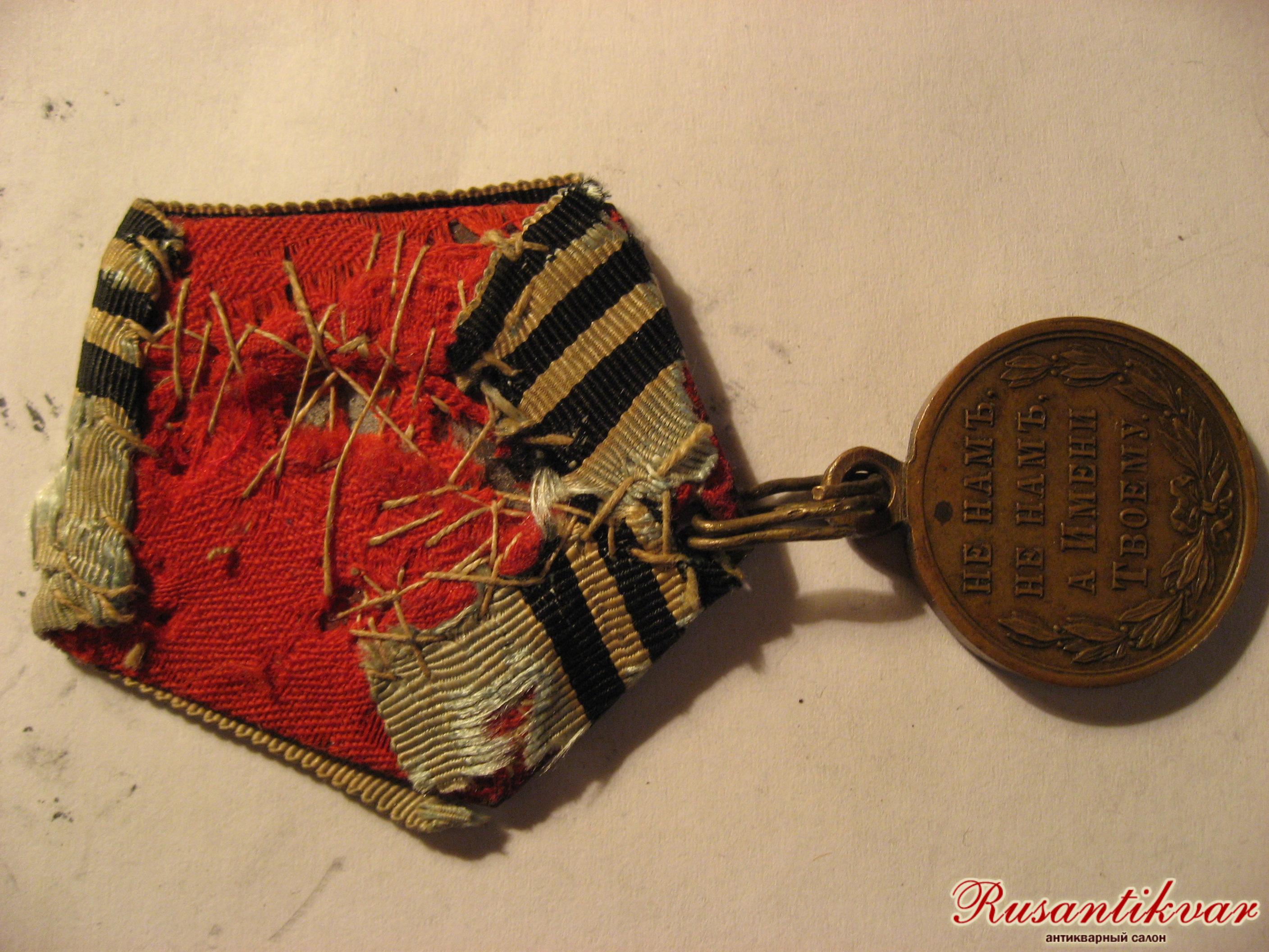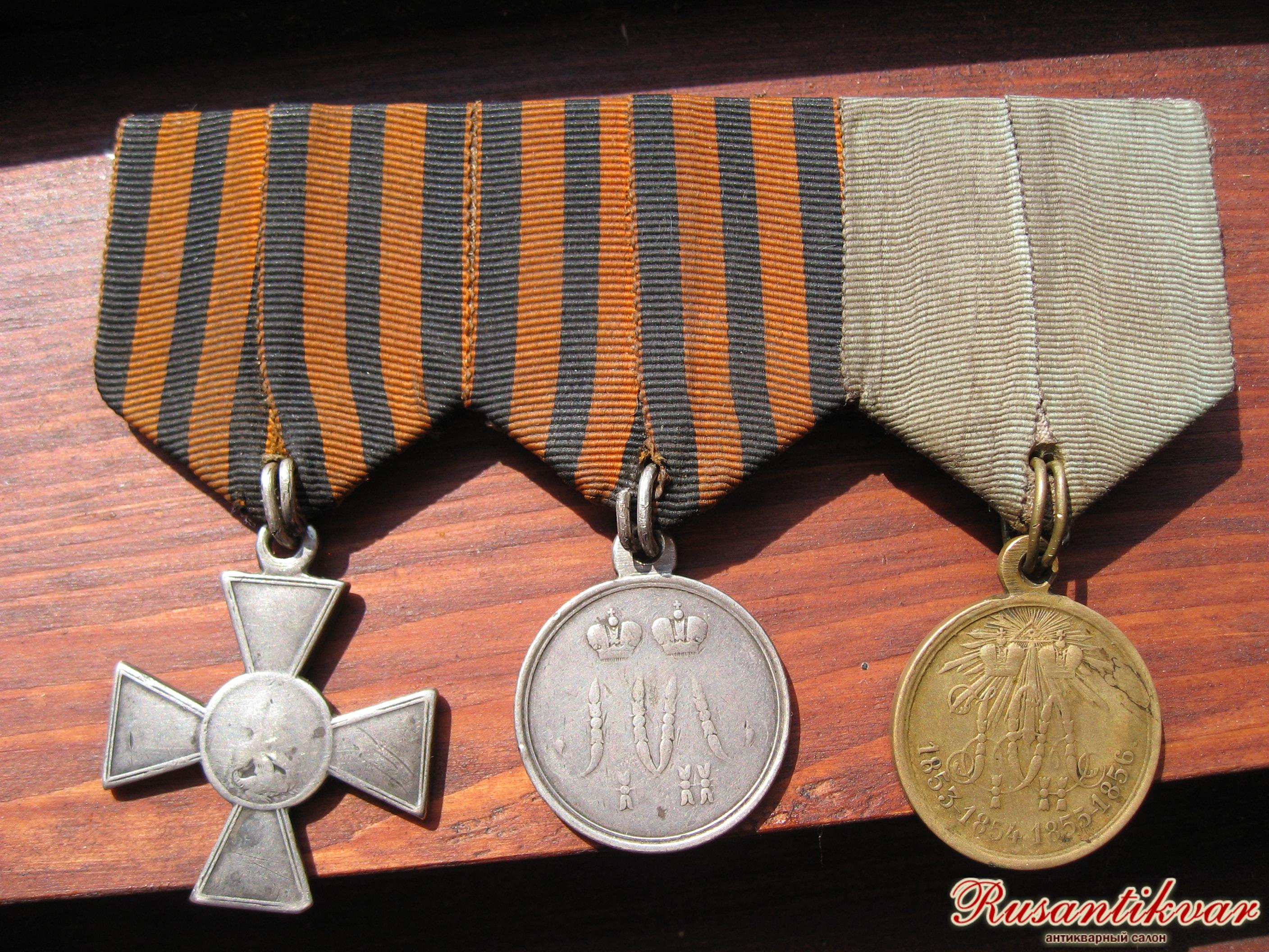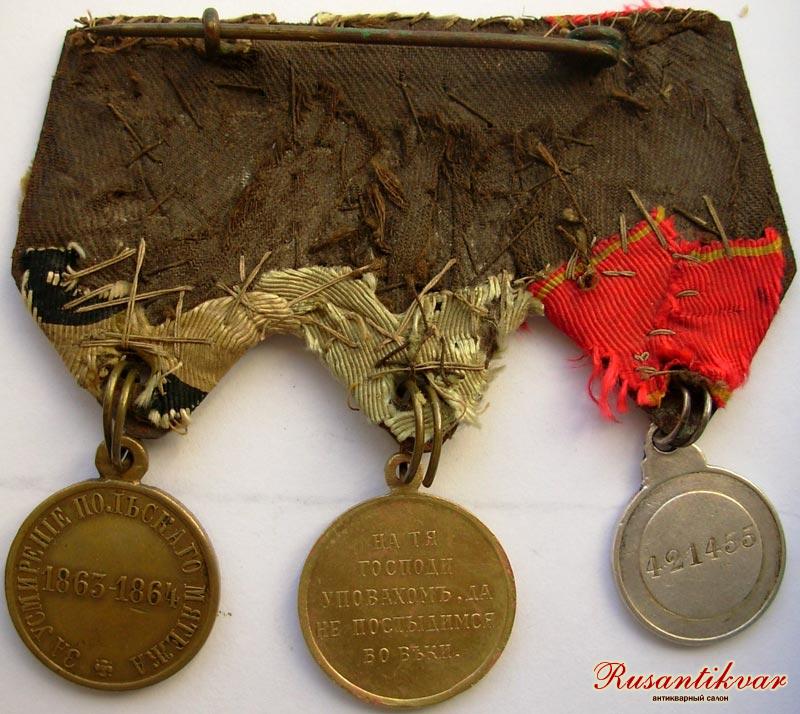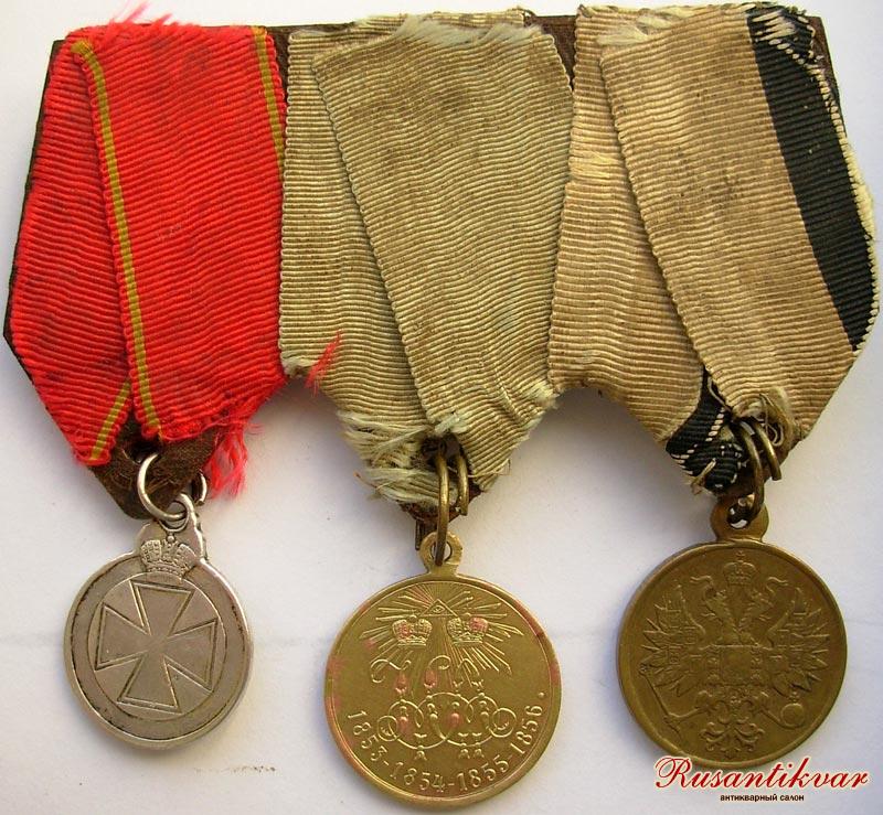 Колодка на три награды: Медаль "В память войны 1853-1856 гг." (светлая бронза), Медаль "За русско-турецкую войну 1877-1878 гг." (светлая бронза), Медаль "За Усердие" с портретом Императора Александра III