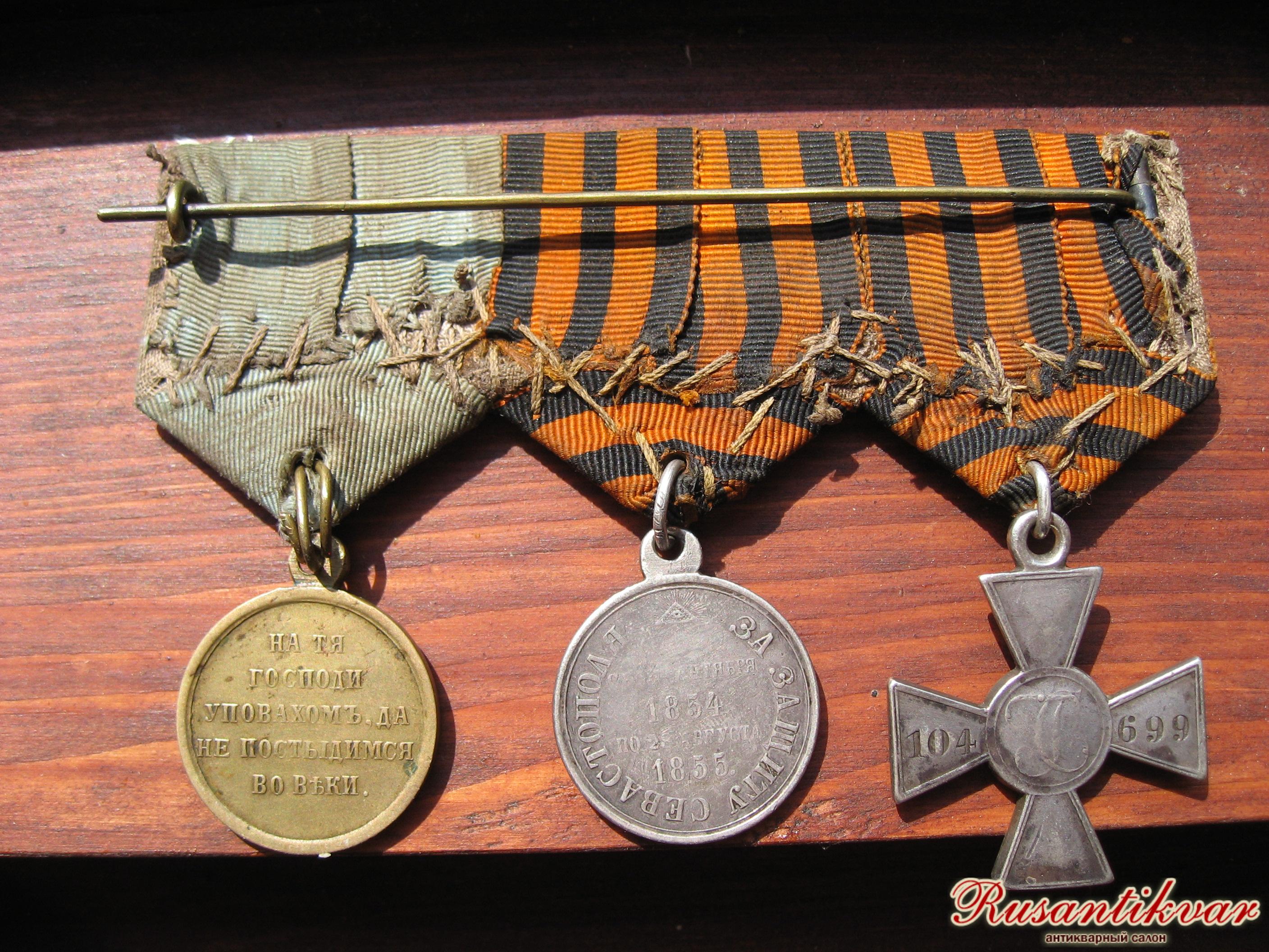 Колодка самодельная на три награды: Знак отличия Военного ордена №104699, медаль "В память войны 1853-1856 гг." и медаль "За Защиту Севастополя".