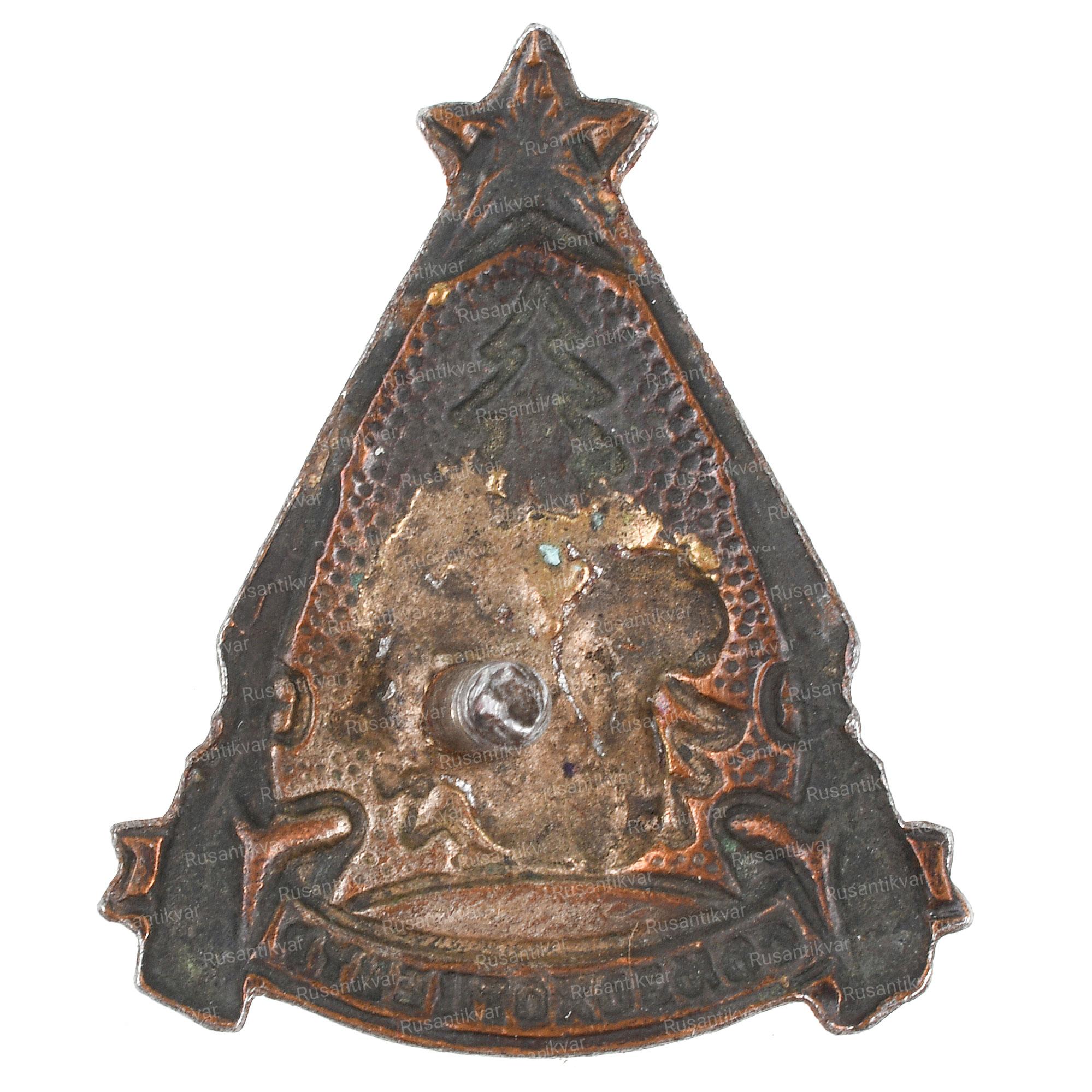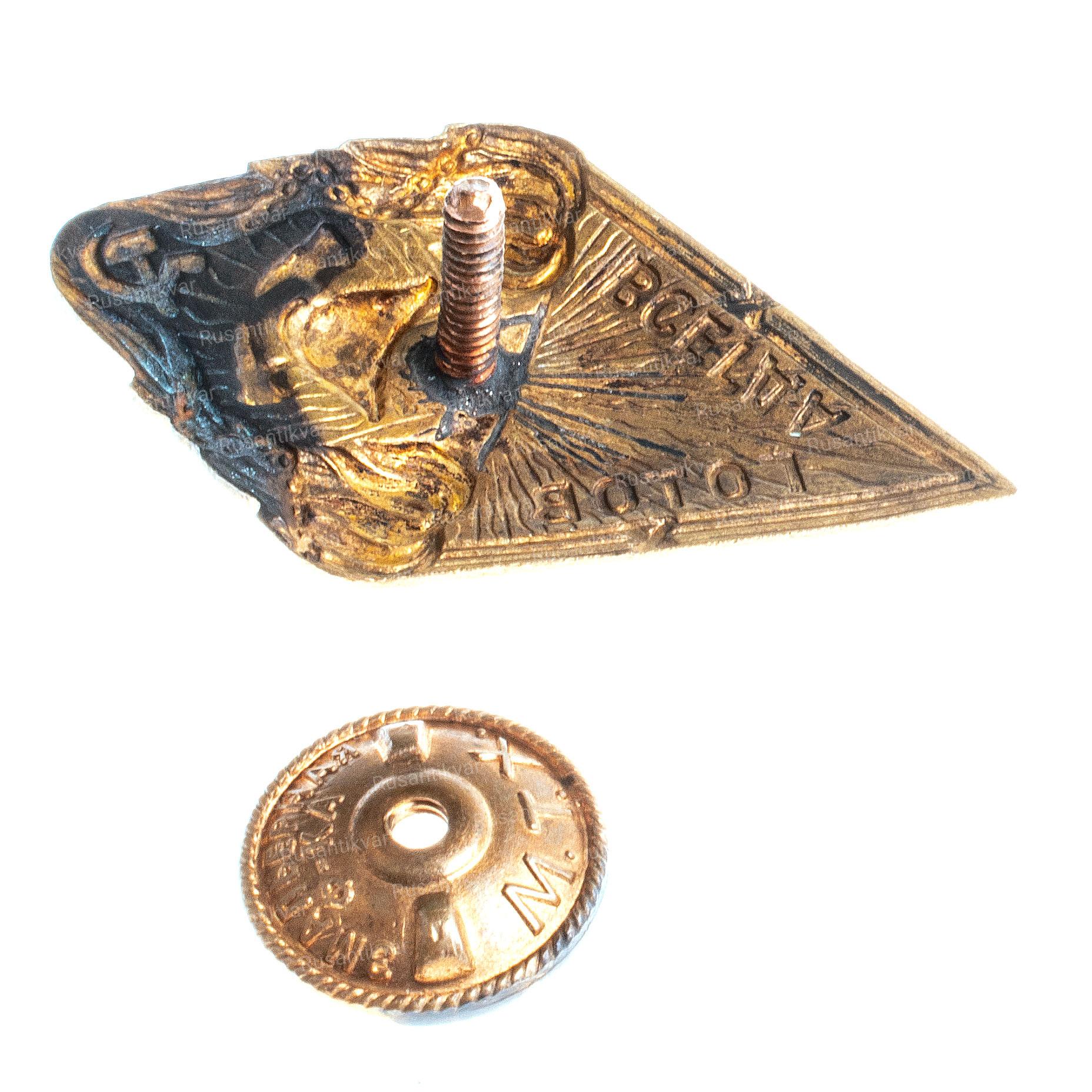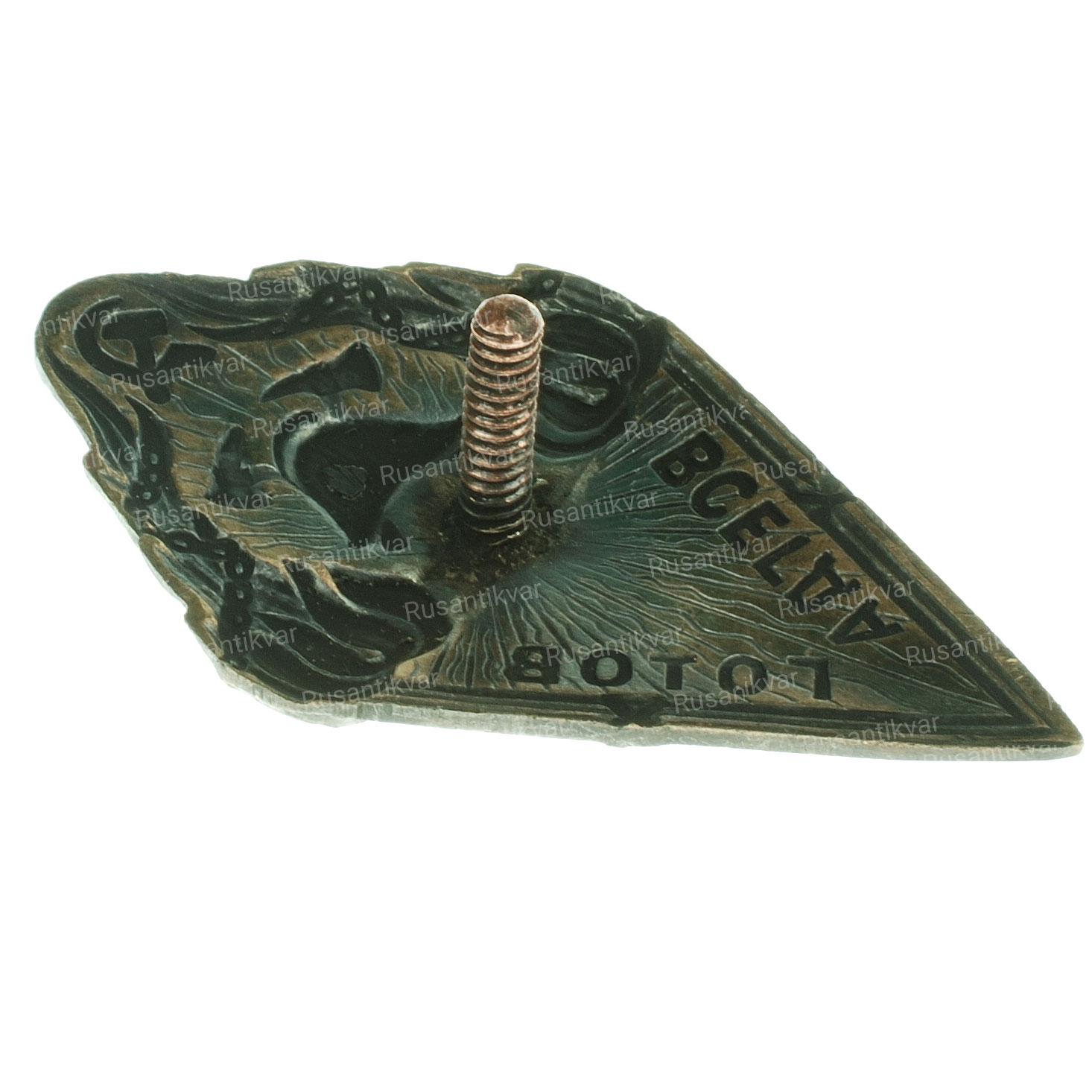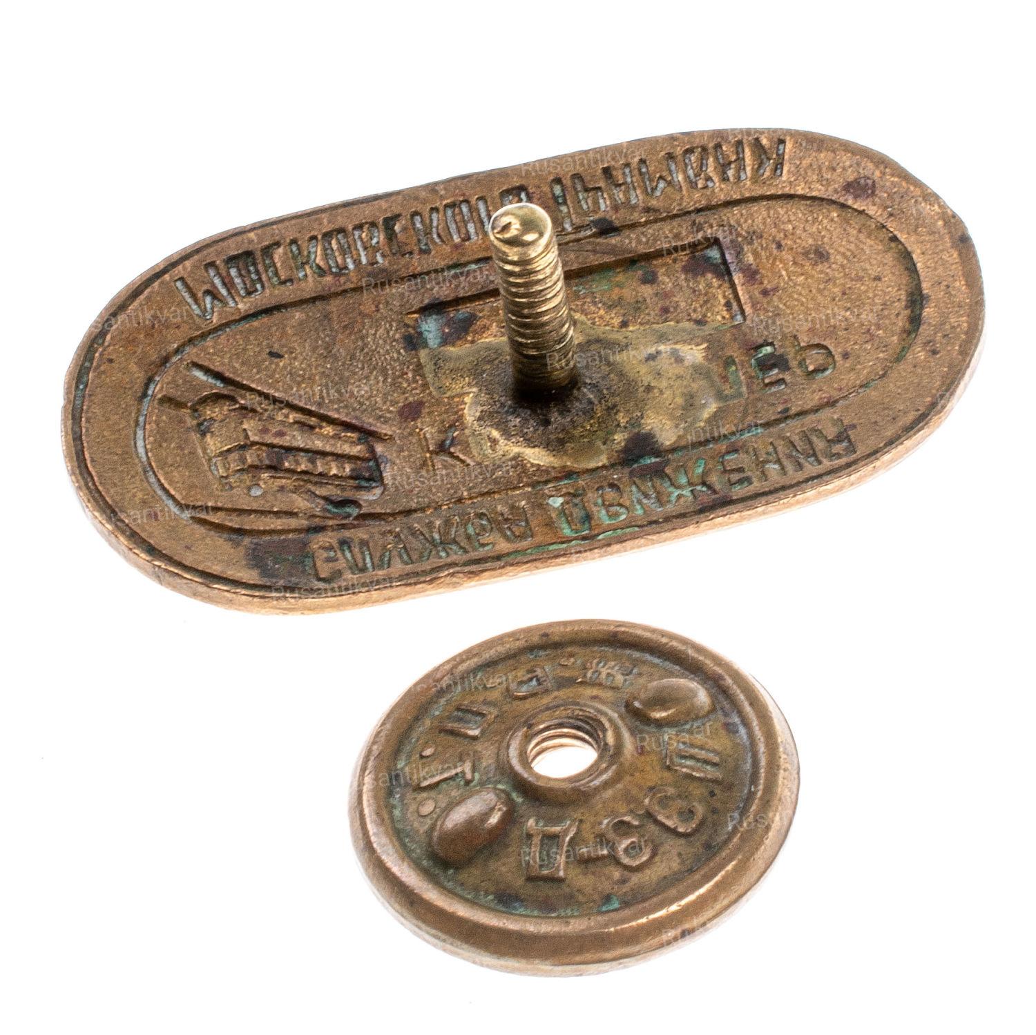 Москва, фабрика МТХ (Московское Товарищество Художников), 1940 - е гг. На гайке выбито "обра. мелал / з-д / М.Т.Х." Бронза, золочение, эмаль 15.5 гр. Размеры 47х27.3мм. Сохранность очень хорошая (XF). Редкий (Р1). Было изготовлено 1.000 экз.