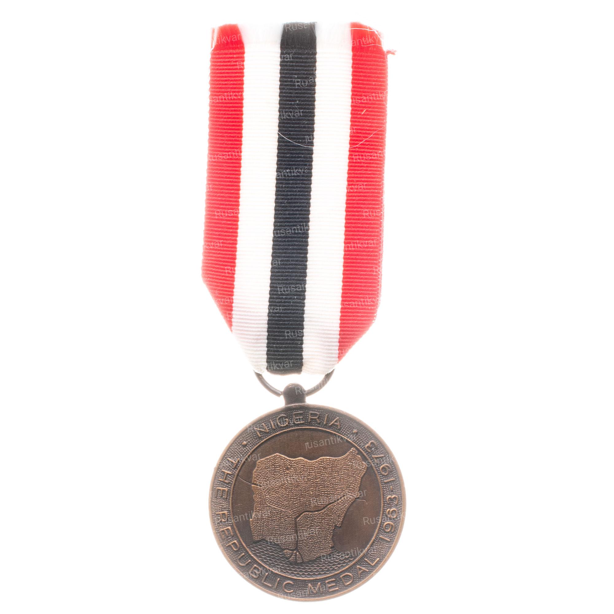 Реверс: изображение контурных очертаний границ Республики Нигерии, а также двух крупнейших рек, Нигера и Бенуэ (в нижнем течении образуют дельту реки Нигер впадающую в Гвинейский залив). Надпись по окружности на английском языке NEGERIA. THE REPUBLIC MEDAL 1963-1973 (русский перевод; НИГЕРИЯ. МЕДАЛЬ РЕСПУБЛИКИ 1963-1973 гг.).