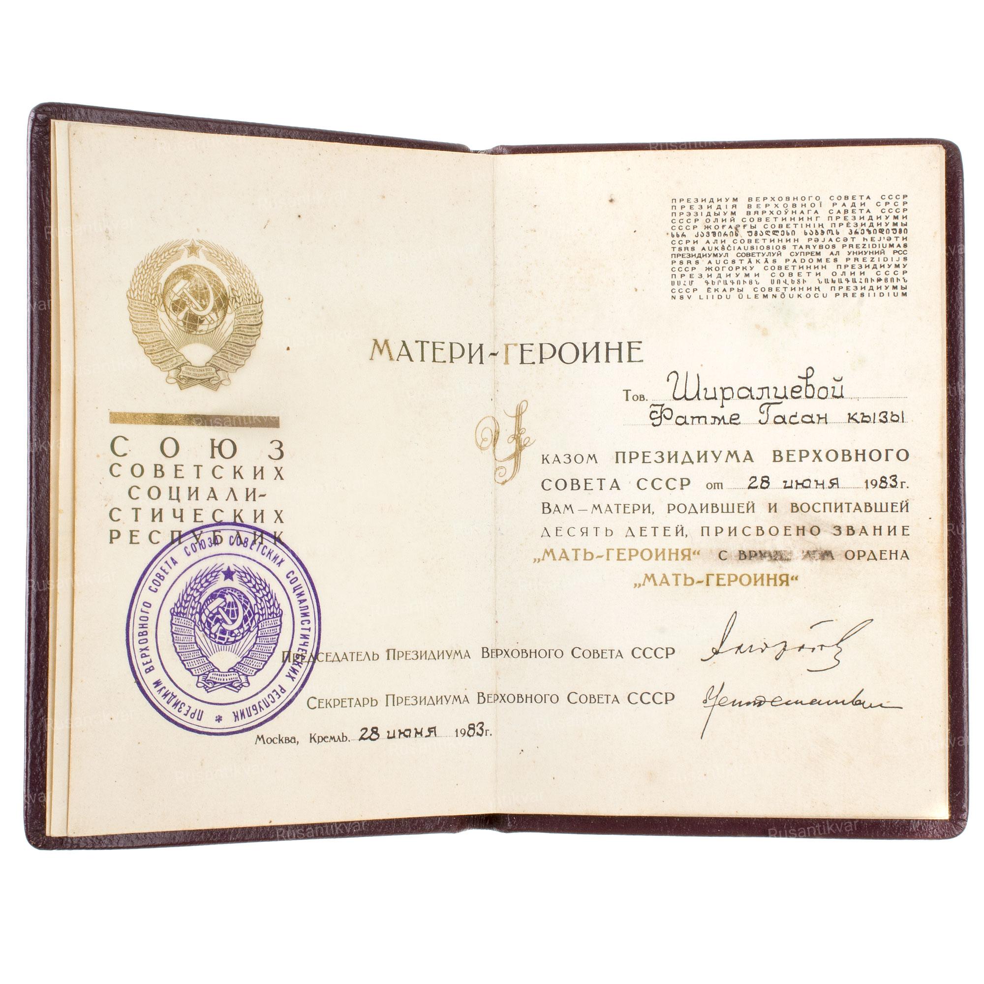 Согласно «Положению о звании „Мать-героиня“», оно присваивается с одновременным награждением орденом матерям, родившим и воспитавшим 10 и более детей, по достижении последним ребёнком возраста 1 года и при наличии в живых остальных детей этой матери.