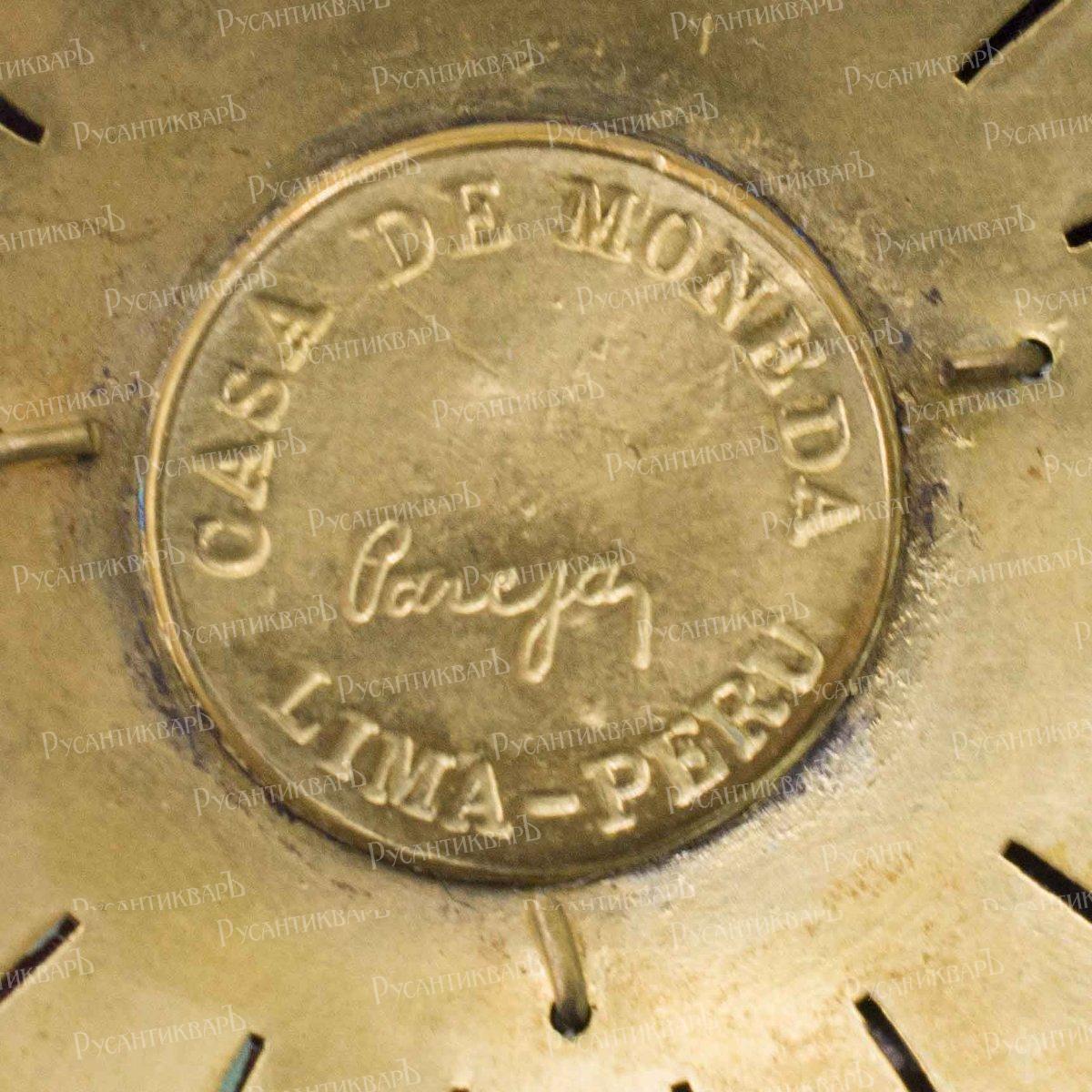 Перу, г Лима, Национальный Монетный двор. На оборотной стороне выбито: "CASA NASIONAL DE MONEDA LIMA-PERU / НАЦИОНАЛЬНЫЙ МОНЕТНЫЙ ДВОР ЛИМЫ-ПЕРУ". Серебро, эмаль, лента, 22.76 гр. Размер 45.73 х 32.81 мм. Сохранность отличная (UNC). Довольно редкий (Р).