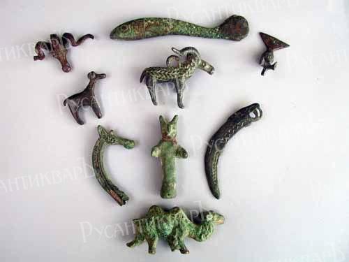 Разнообразные амулеты кобанской культуры в виде животных и предметов.