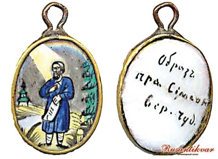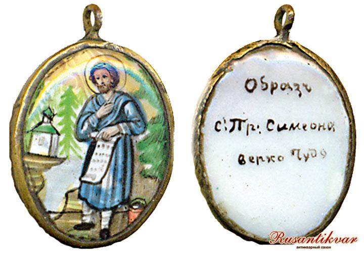 Еще одна финифтяная иконка праведного Симеона Верхотурского в целом повторяет предыдущюю. Немного отличается лишь текст на оборотной стороне: «Образъ с. пр. Симеона Верхо Чудо».