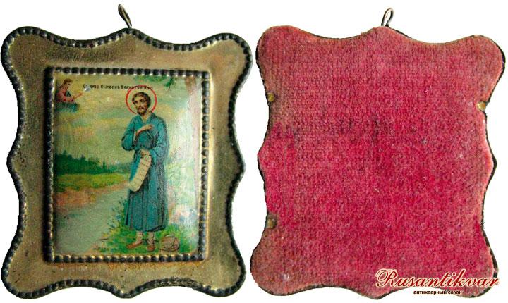 Финифтевый образок Св. Симеона Верхотурского, маленький, в металлической рамочке, на обороте обтянут малиновым бархатом».