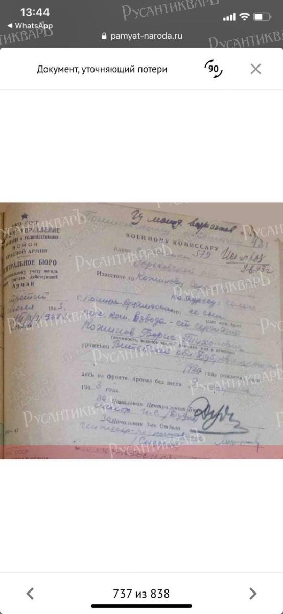 После запросов в соответствующие органы было установлено что владельцем ордена является Кожин Борис Тихонович, 1920 го года рождения, место рождения Белорусская ССР, Витебская обл. Дубровинский район. место призыва Починковский РВК Горьковская обл., Починковский район. Воинское звание старший сержант, место службы 8я стрелковая дивизия. пропал без вести 09.02.1943 года.