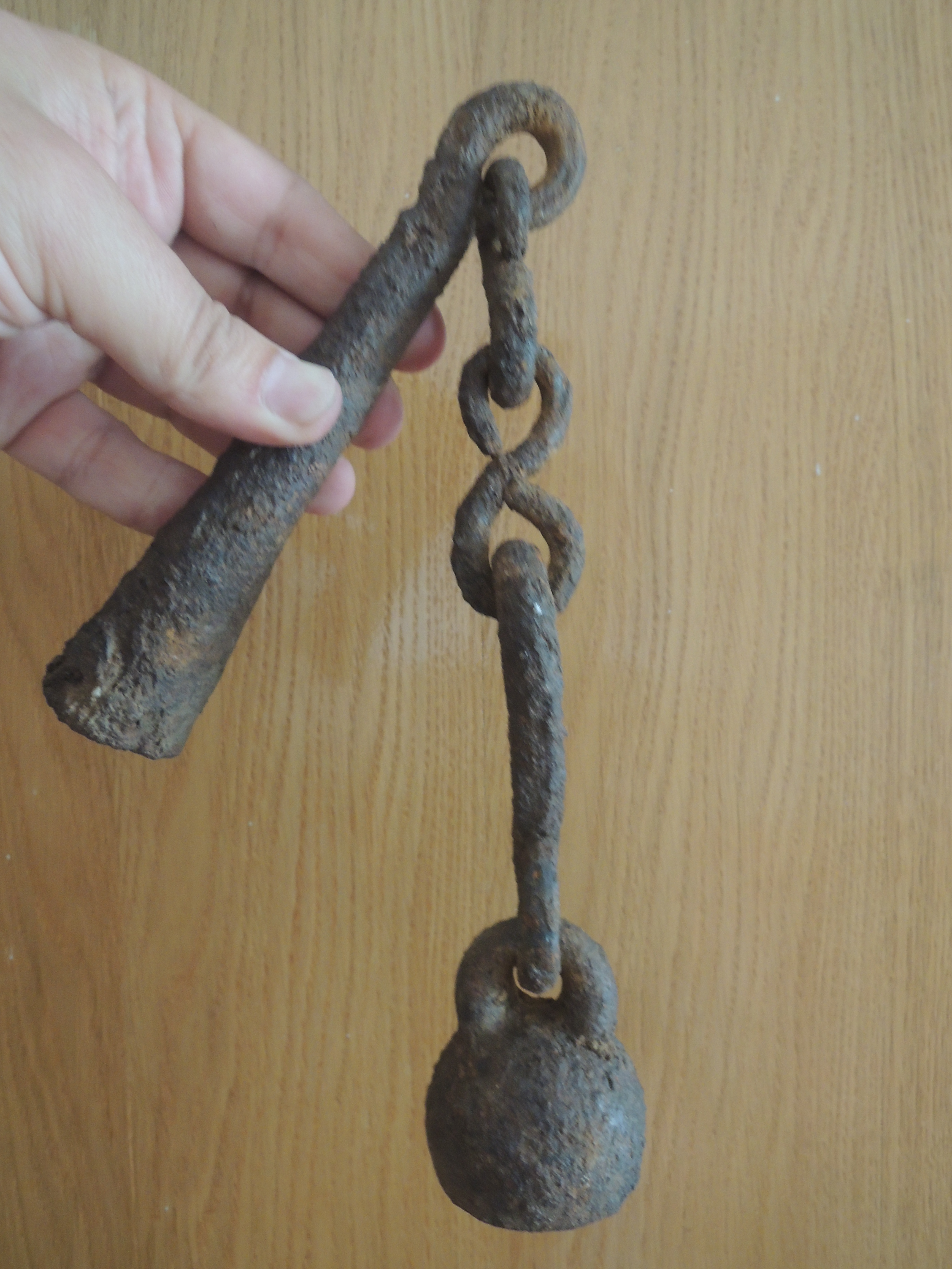 На фото (ИМХО) - обычная весовая гирька. Приказчик какой-нибудь повесил на цепь - от греха...