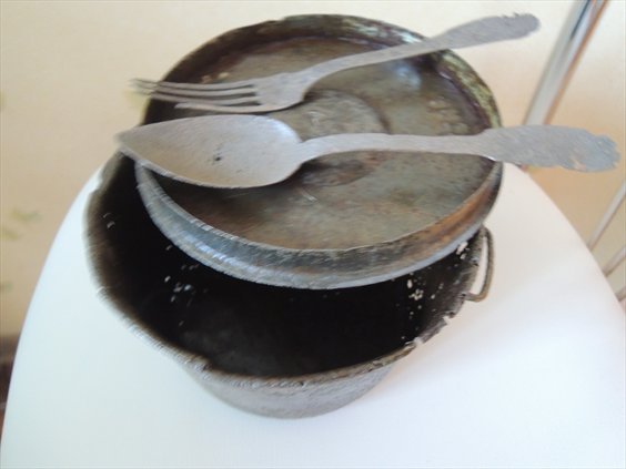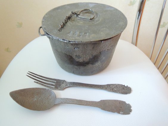 Всем известный набор французских бойцов - штатный котелок (участника Инкерманского боя, сбросил в ямку котел флягу и тесак...) и классические Фр.ложка и вилка.
