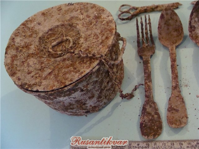 Сохран очень приятный . Пару лет назад видел вот такие находки неизвестного мне копаря на одном из форумов...КОТТ писал(а): Всем известный набор французских бойцов - штатный котелок (участника Инкерманского боя, сбросил в ямку котел флягу и тесак...) и классические Фр.ложка и вилка.