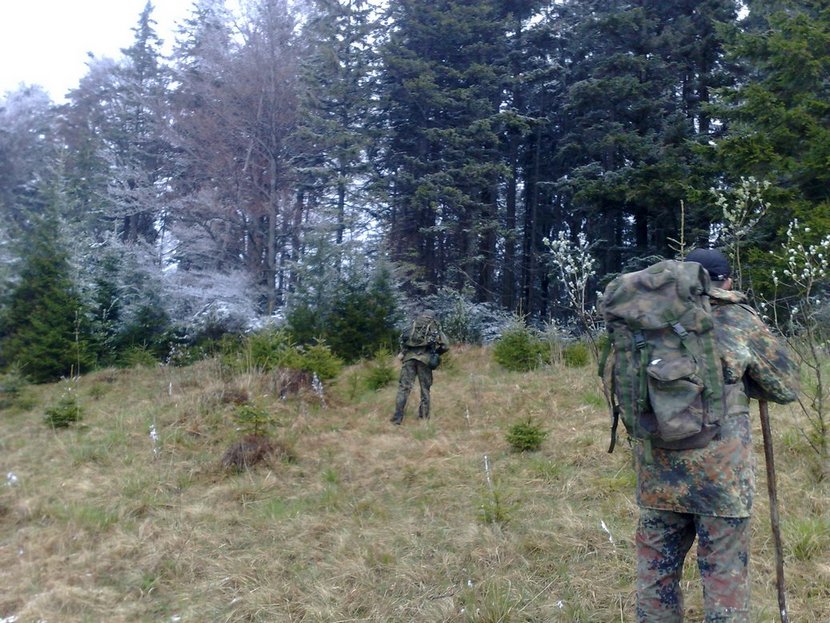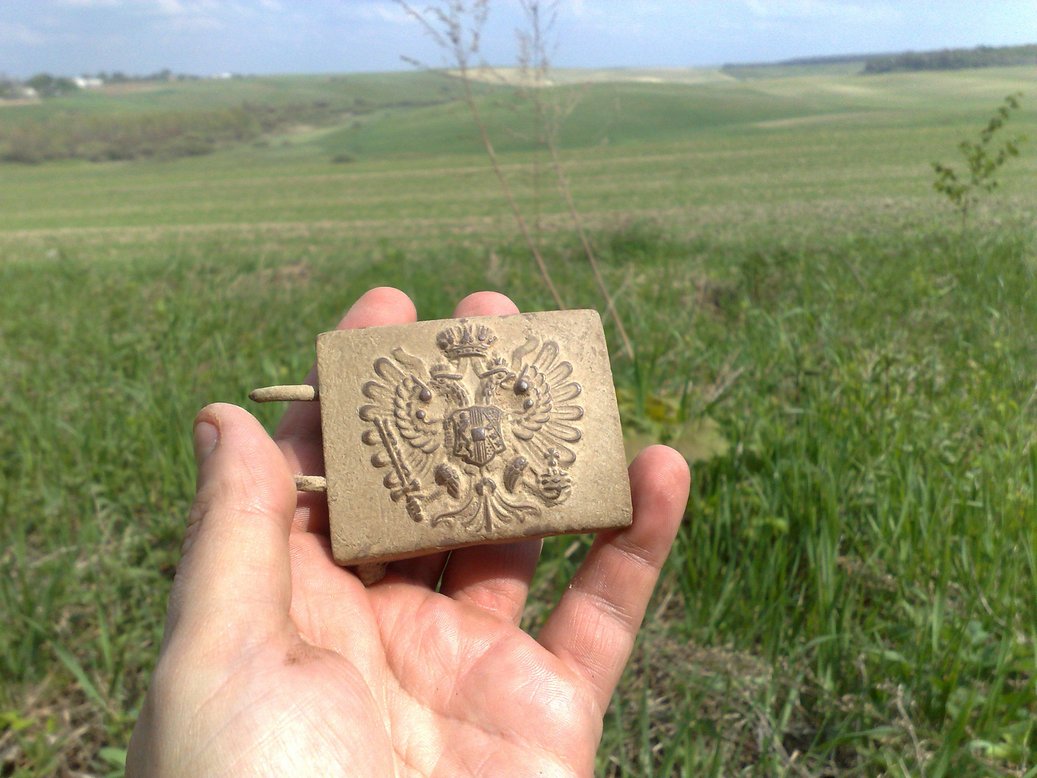 Май.Вчерашняя разведка новых мест происходила в исключительно благоприятных погодных условиях .Но так как к капризам природы мы уже привыкши,то вниз спускались темноте.Итог дня-пару пряг,фляги,фурнитура,сфотографировали только одну,находку товарища,который не зарегистрирован на форуме-редчайшую цинковую австрийскую пряжку с накладным орлом .