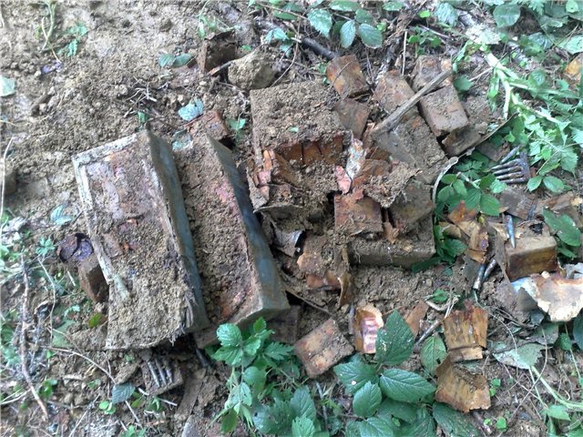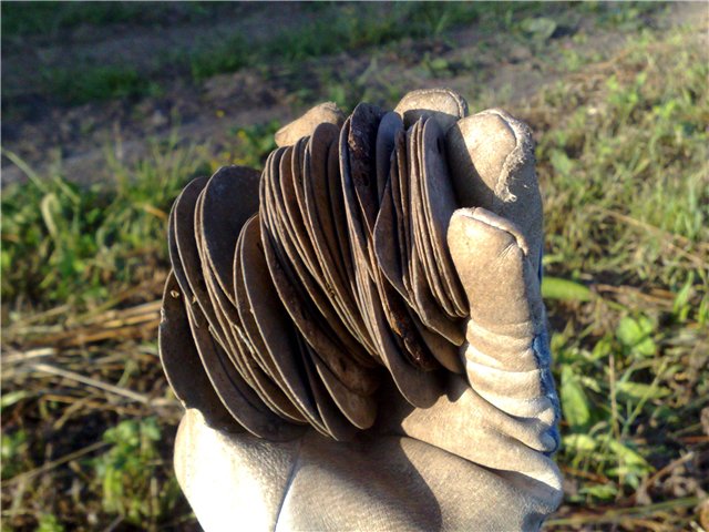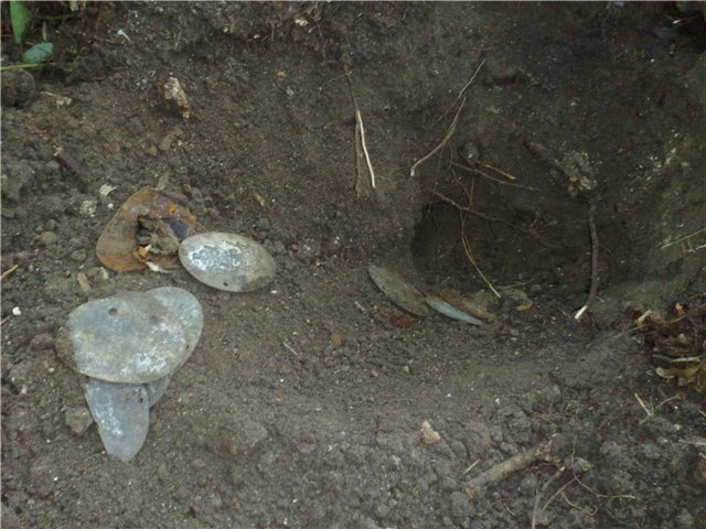 Июнь.На этой неделе несколько раз приходила в голову мысль-возможно ли найти сброс жетонов,и сразу за ней другая-НЕВОЗМОЖНО,ТАК НЕ БЫВАЕТ!.Собрались с утра с сыном в деревню,аппарат забросил в багажник и поехали.За рулем,водку не пить,лесок с позициями рядом,расчехлился и давай гулять по окопам.Сигналов не особо,вдруг четкий цветной сигнал(и не пойму что,с СЕ при практике знаеш с большой долей вероятности что в земле).Наиболее похоже на дистанционную трубку с металлической задницей,думаю всеравно выкопаю,посмотрю.Хватило ума копать с запасом,снял верхний грунт и увидел пару жетонов.Тут уже нафиг перчатки,давай руками вытаскивать рассыпавшиеся жетоны.Вытягиваю,складываю в кучку,а они не кончаются.