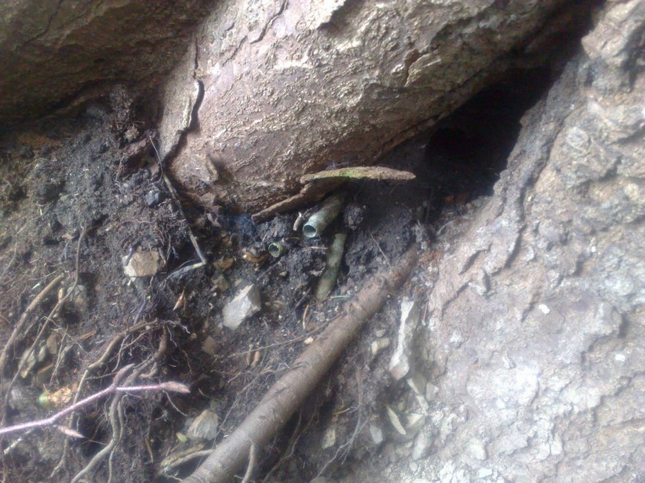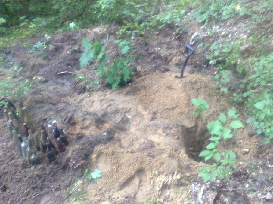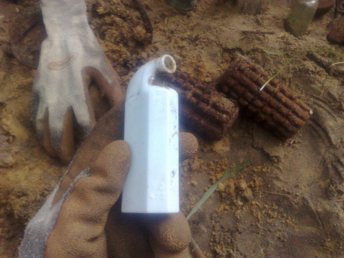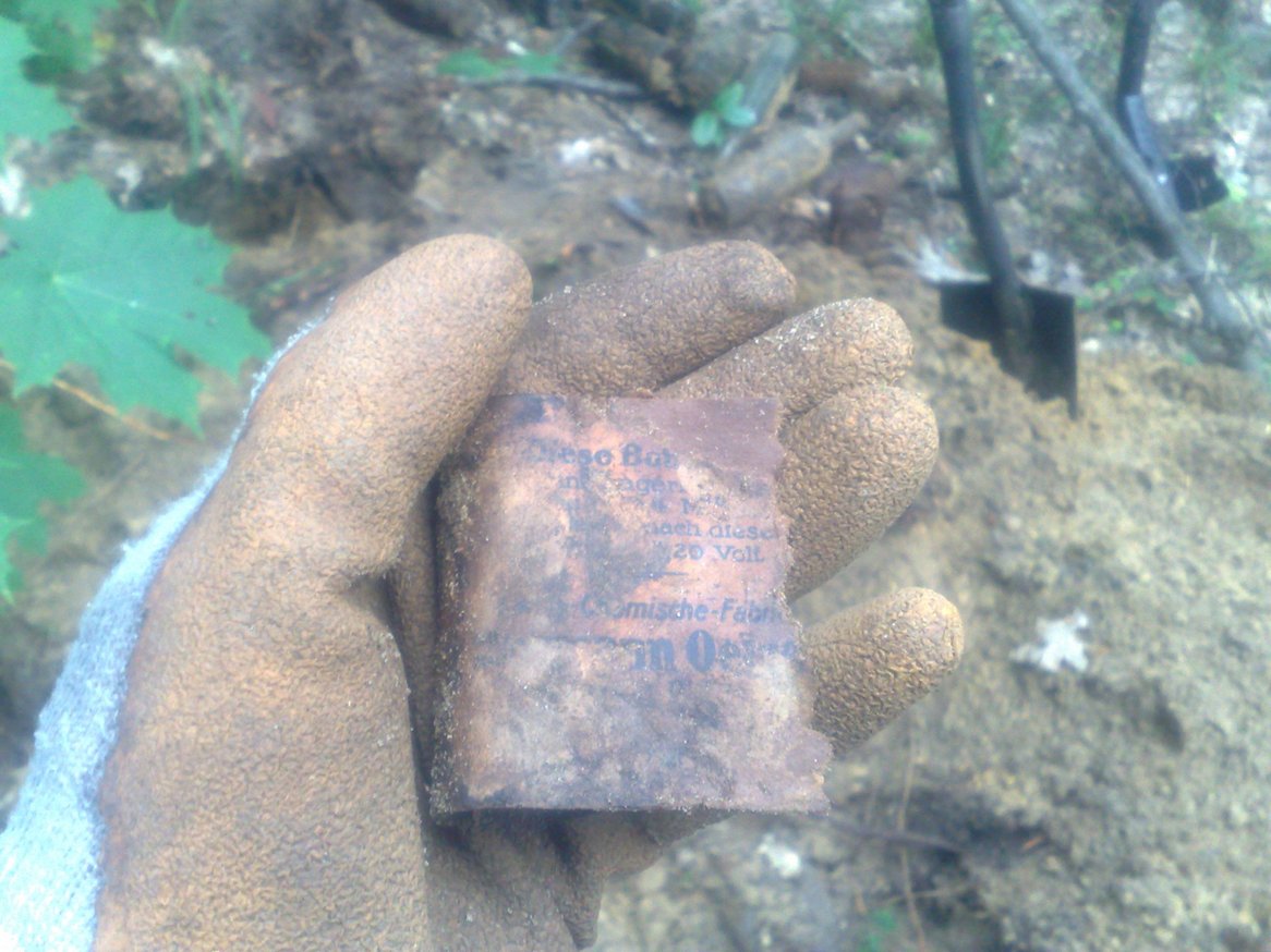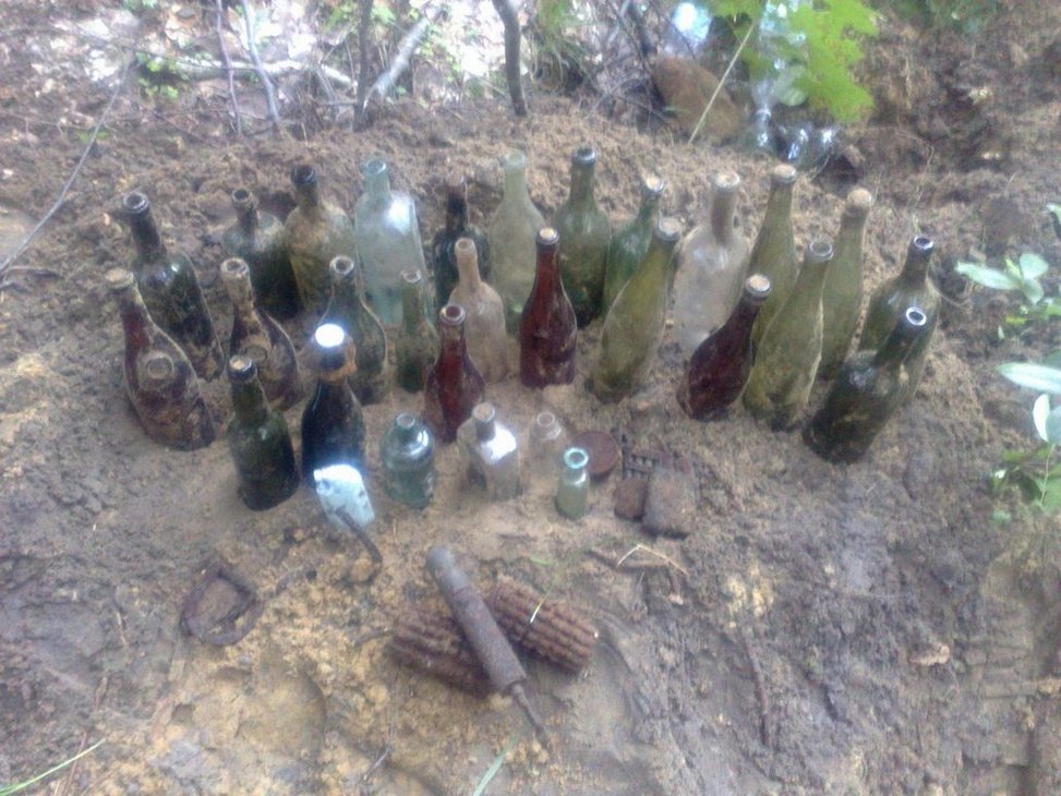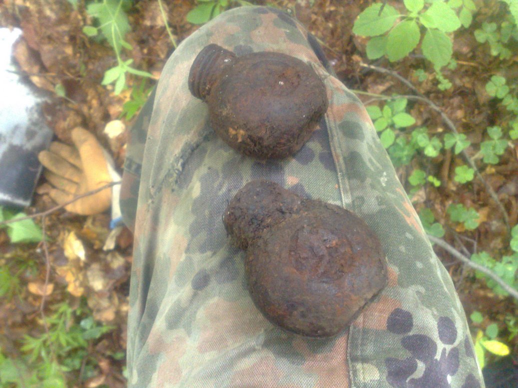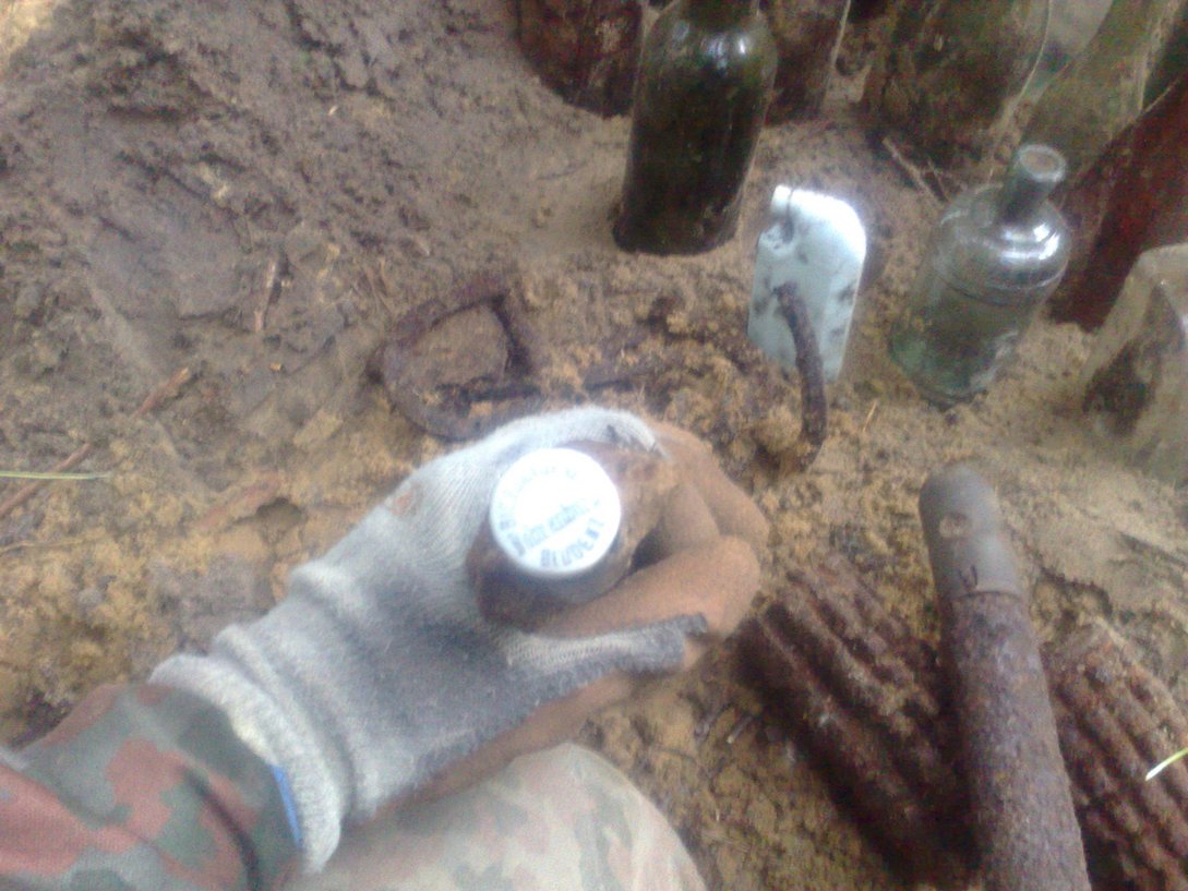 .Вот попалась такая гранатно-бутылочная мусорка(по видимому так надрались шнапса что и гранаты выкинули в мусорку).Попались батарейки ПМВ,которые по размеру и форме очень похожи на совдеповские,сразу вспомнилось детство.Так что если надумаю гнать самогон,то тарой обеспечен