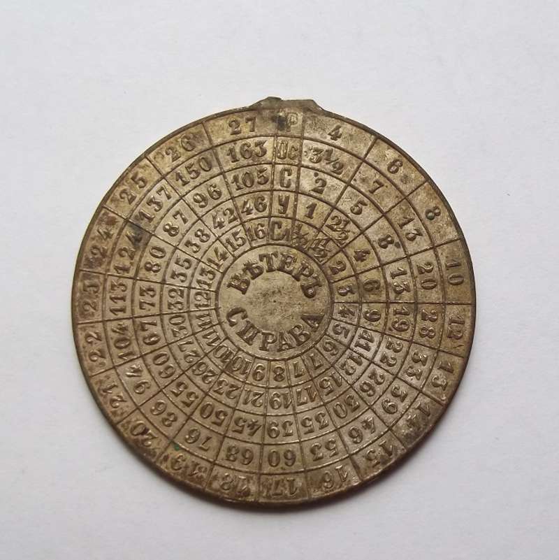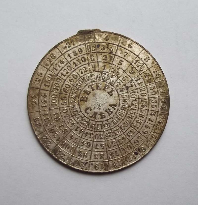 Таблица поправок прицела для пулеметчиков.В таблице указаны поправки в прицеливании при стрельбе из пулемета при боковом ветре.С одной стороны при ветре справа ,с другой при ветре слева.При помощи таблицы можно быстро ращитать поправку с учотом дистанции до цели и скорости бокового ветра.Использовалась в РИА.Выполнена в виде медальена чтобы носить на шее и всегда была под рукой.