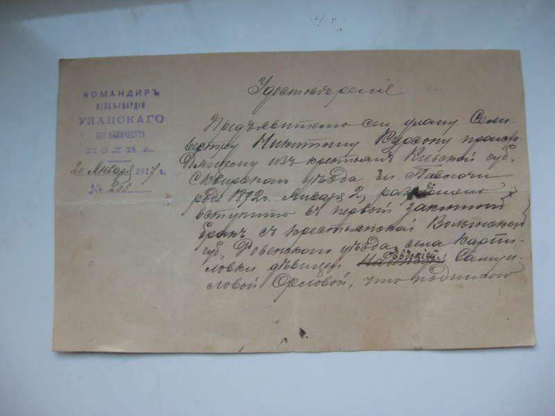 Вот мое недавнее приобретение: Удостоверение Лейб-гвардии уланского полка Его Величества
