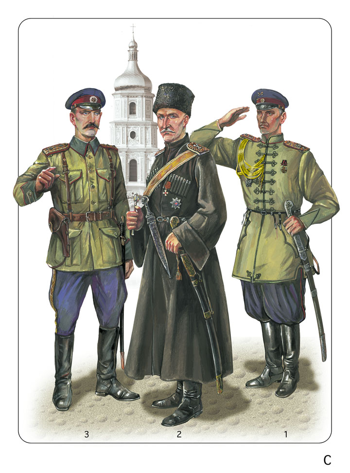 Сердюкской пехоте, артиллерии и инженерам не успели пошить новое регламентное обмундирование в "историческом" стиле (схожее с С1) и им пришлось носить форму бывшей российской армии, правда, с цветными полевыми сердюкскими погонами и украинской кокардой. У офицеров могли быть цветные сердюкские фуражки и парадные погоны. Многие старшие офицеры пошили себе новую походную форму, изображенную здесь. Приказ разрешал шить воротник и обшлага из материала более темного цвета, чем и воспользовался этот капитан, использовав немецкий материал цвета "фельдграу". Только офицеры и генералы Сердюкской дивизии носили на штанах лампасы из галуна цвета прикладного металла. И только военнослужащие этой дивизии имели особенную кокарду в виде креста с перекрещенными булавами. Офицер вооружен драгунской офицерской шашкой образца 1881/1909 гг. и револьвером "Наган" (стандартное офицерское вооружение армии Российской империи). Его экипировка состоит из поясного ремня и портупеи образца 1912 года, хотя в армии Украинской Державы была возвращена старая портупея образца 1910 года (с единственным ремешком от правого плеча к левому бедру). После того, как восставшие войска Директории приняли красную матерчатую кокарду, главнокомандующий Армией УД генерал граф Келлер ввел в своих войсках белую.