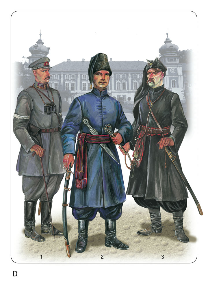 После захвата власти Директорией была предпринята третья (и последняя) попытка ввести в армии "исторический" казачий стиль. В январе был обнародован приказ о введении полевого обмундирования по образцу "Серожупанной" дивизии и парадного – по образцу "Синежупанной". Несмотря на то, что никаких условий к выполнению этого приказа не было, некоторые добровольческие повстанческие отряды, захватив и разграбив склады, частично выполнили его. Многие повстанцы всячески старались украсить мундир согласно своему вкусу. Но первое место в этом соревновании, несомненно, занимали командиры, как изображенный здесь атаман Запорожской Сечи Божко. Чтобы придать себе вид "настоящего" казачьего атамана, он ограбил музей, присвоив полковничий пернач и казачью саблю XVII века. Завершает "казацкий ансамбль" длинный тканый пояс расцветки, характерной для Киевщины. Своенравный Божко был арестован летом 1919 года.