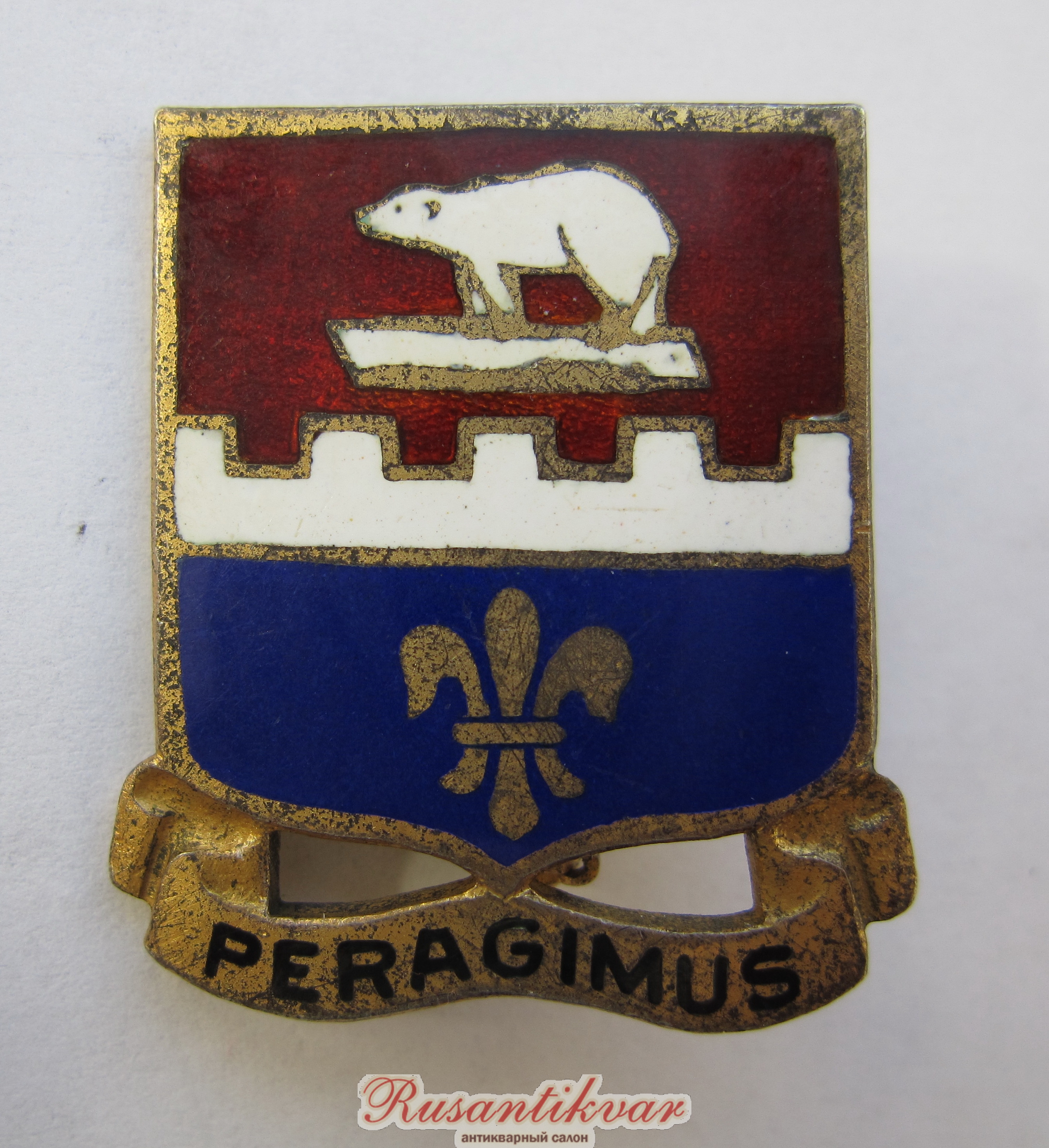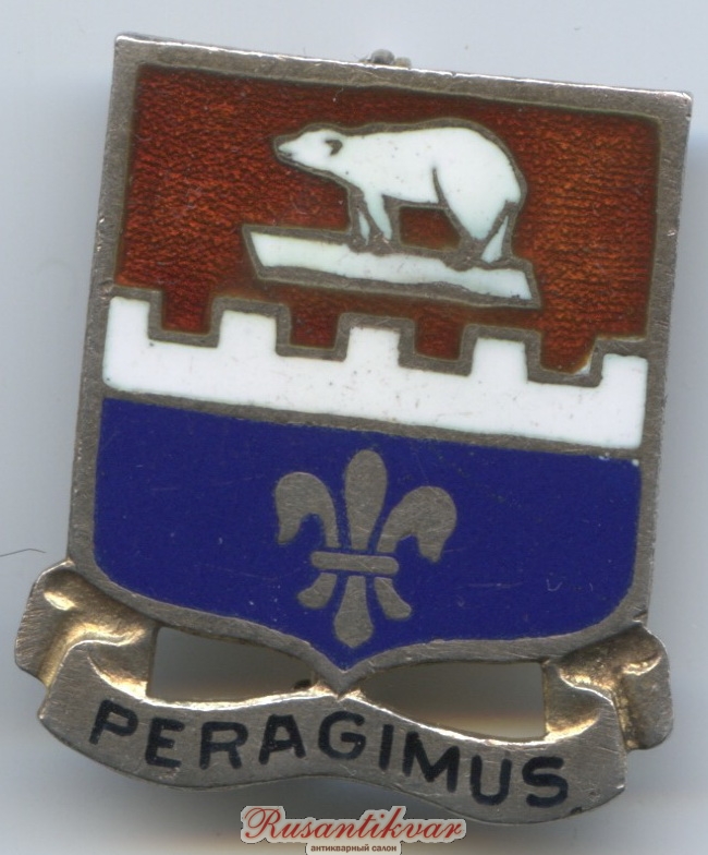 Не смотря на то, что право именоваться "Полярными медведями" американские военные получил еще во время своего пребывания в России, полковой знак появился несколько позже. Первыми отличилась пехота. В период сборов в августе 1924 г. в лагере Кастер офицеры полка, участвовавшие в "миссии по освобождению Русского Севера от большевиков" учредили в честь пятилетия тех событий полковой знак, на котором были изображены птички (отсылка к Детройту, из которого была призвана основная часть резервистов 339-го), белый медведь (как память о зиме в Приполярье) и надпись кириллицей "Штык решает" (в чем пришлось убедиться этим парням на нашей земле). Причем, что забавно - надпись была сделана изначально не совсем правильно по-русски (и на первых знаках это хорошо видно).