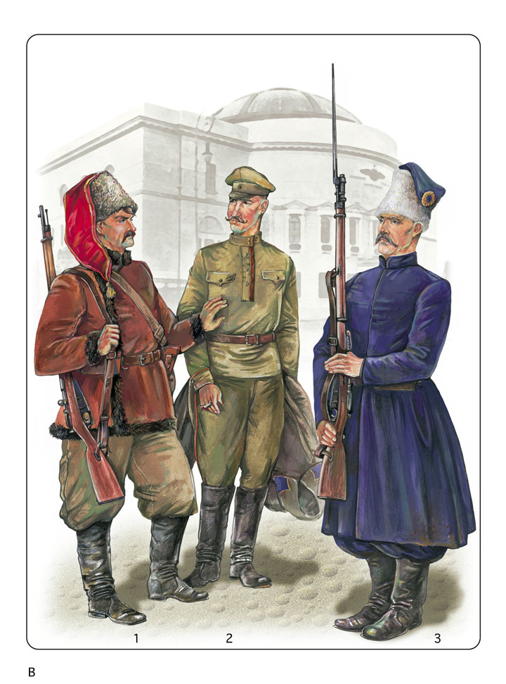 Обмундирование этого солдата отображает военную моду того времени: верх фуражки лишен твердой основы и свободно свисает по бокам, а гимнастерка сильно укорочена. Кроме того, по этой униформе можно проследить политические колебания происходившие в среде этого полка. Его основу составляет мундир, специально введенный для "георгиевских частей": оранжевые выпушки вокруг обшлагов и на штанах и оранжево-черная лента ордена Св. Георгия на планке гимнастерки. Но погоны, как знак "унизительного прошлого царского режима", были спороты еще осенью. По этой же причине лишь частично выполнен приказ о новом обмундировании украинской армии от января 1918 года – узкие синие с желтой выпушкой погоны отсутствуют как на гимнастерке, так и на шинели, но зато на воротнике шинели пришиты петлицы. Согласно приказу на этих петлицах должны были размещаться знак рода войск и название части. Но, похоже этот пункт приказа выполнили только "сечевые стрелки", да и то заменив название на аббревиатуру "СС" (А3). Как знак объявленного нейтралитета отсутствует какая-либо кокарда – "георгиевская" или украинская.