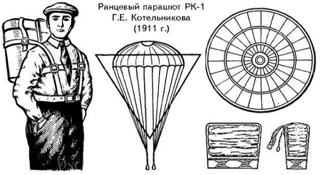 24 сентября 1910 года в Петербурге на Всероссийском празднике воздухоплавания погиб авиатор капитан Л. М. Мациевич. Свидетелем этой трагедии оказался Г. Е. Котельников. Гибель молодого летчика в тот памятный день, писал он позднее, настолько меня потрясла, что я решил во что бы то ни стало построить прибор, предохраняющий жизнь пилота от смертельной опасности . Уже в 1911 году Котельников напряженно работает над проектом,и в 1911 году изобрёл принципиально новый парашют РК-1. Парашют Котельникова был компактен. Его купол изготовлен из шёлка, стропы разделялись на 2 группы и крепились к плечевым обхватам подвесной системы. Купол и стропы укладывались в деревянный, а позднее алюминиевый ранец. Позже, в 1923 году Котельников предложил ранец для укладки парашюта, сделанный в виде конверта с сотами для строп. За 1917 год в русской армии было зарегистрировано 65 спусков с парашютами, 36 — для спасения и 29 добровольных. После революции первый, вынужденный прыжок с самолёта был выполнен 23 июня 1927 года лётчиком-испытателем М. М. Громовым, впоследствии Героем Советского Союза.
