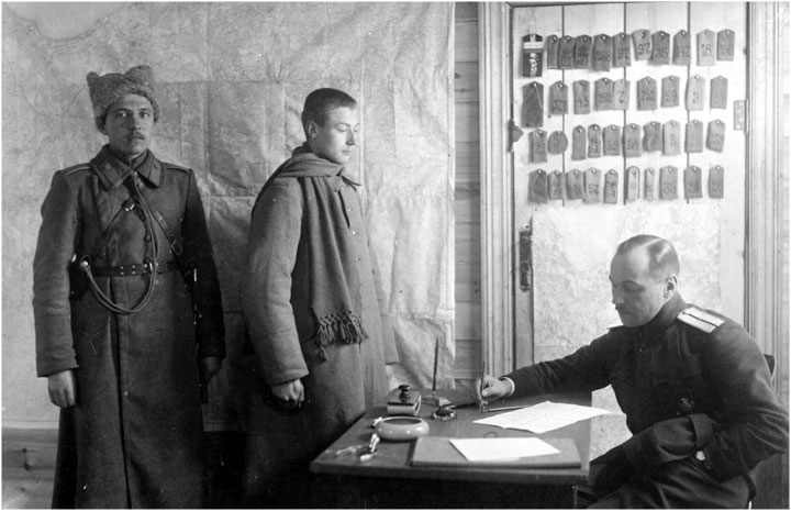 Допрос пленного немца. На стене - образцы трофейных погон. 1915-1916 гг.