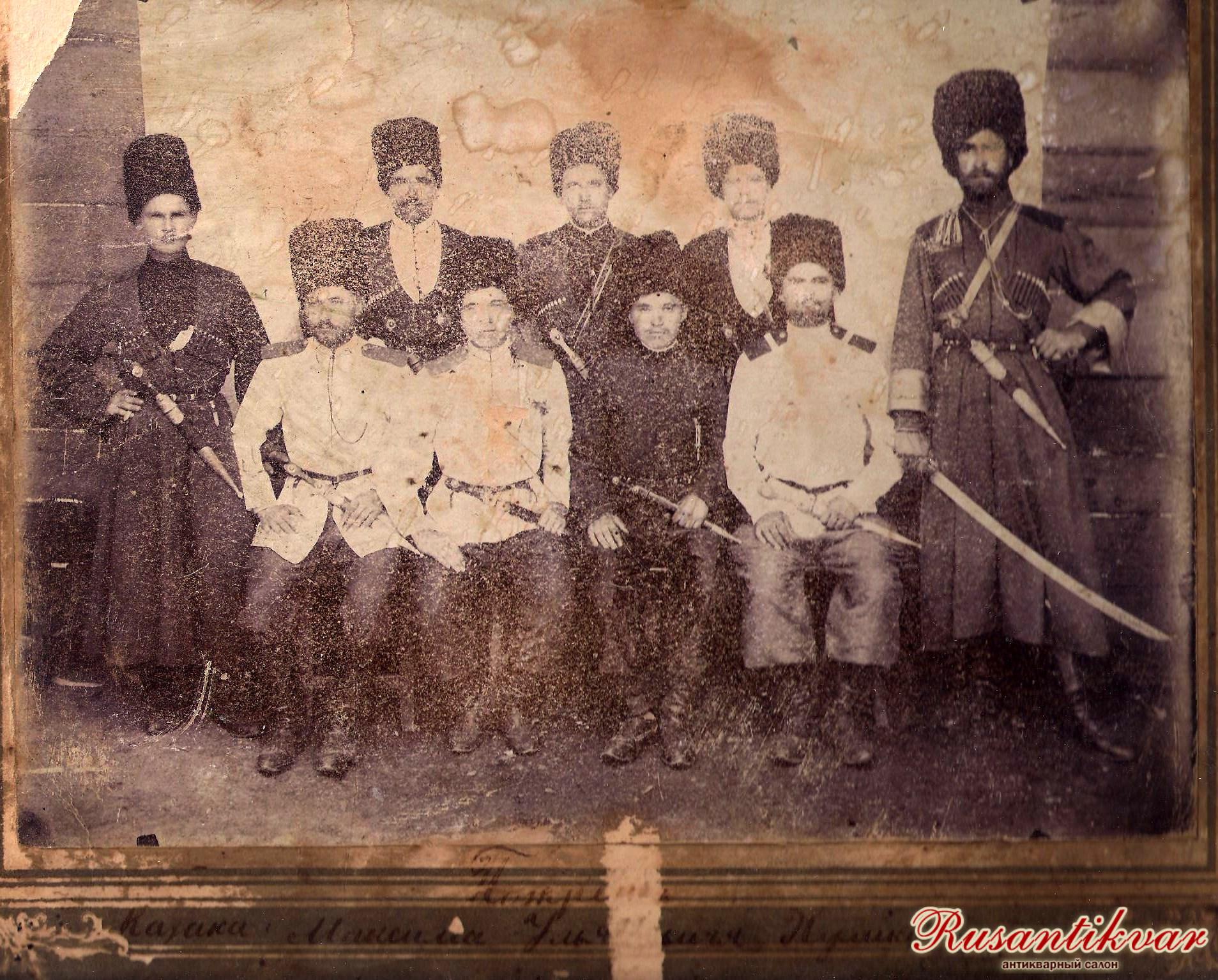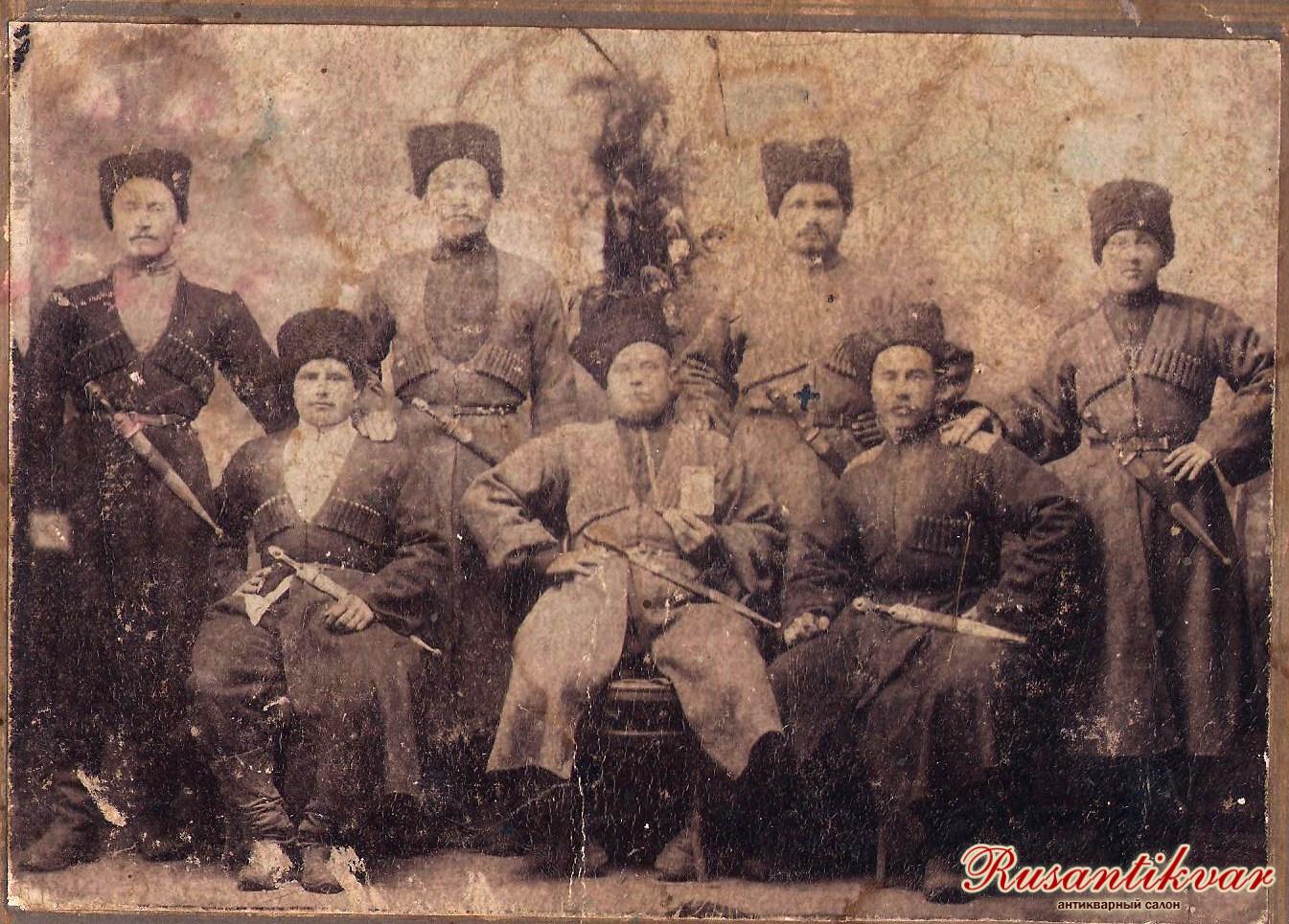 В белой черкеске второй справа сидит казак Гражданкин.Первый справа стоит казак Каменев.Станица Новомарьевская.
