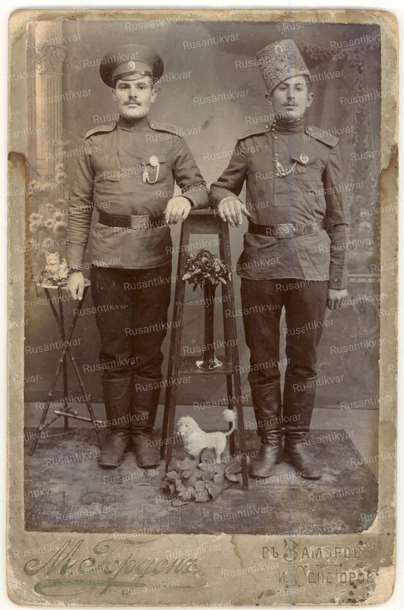 У одного из офицеров на груди орден Св.Станислава 3 степ.без мечей ( два нижних орла на ордене отсутствуют).Медаль "В память Русско-Турецкой войны 1877-1878 гг". и медаль "В память царствования Императора Александра 3".Один офицер награжден орденом Св.Георгия 4 степ.,у полковника в центре Знак отличия ордена Св.Георгия 3 степ.с бантом.