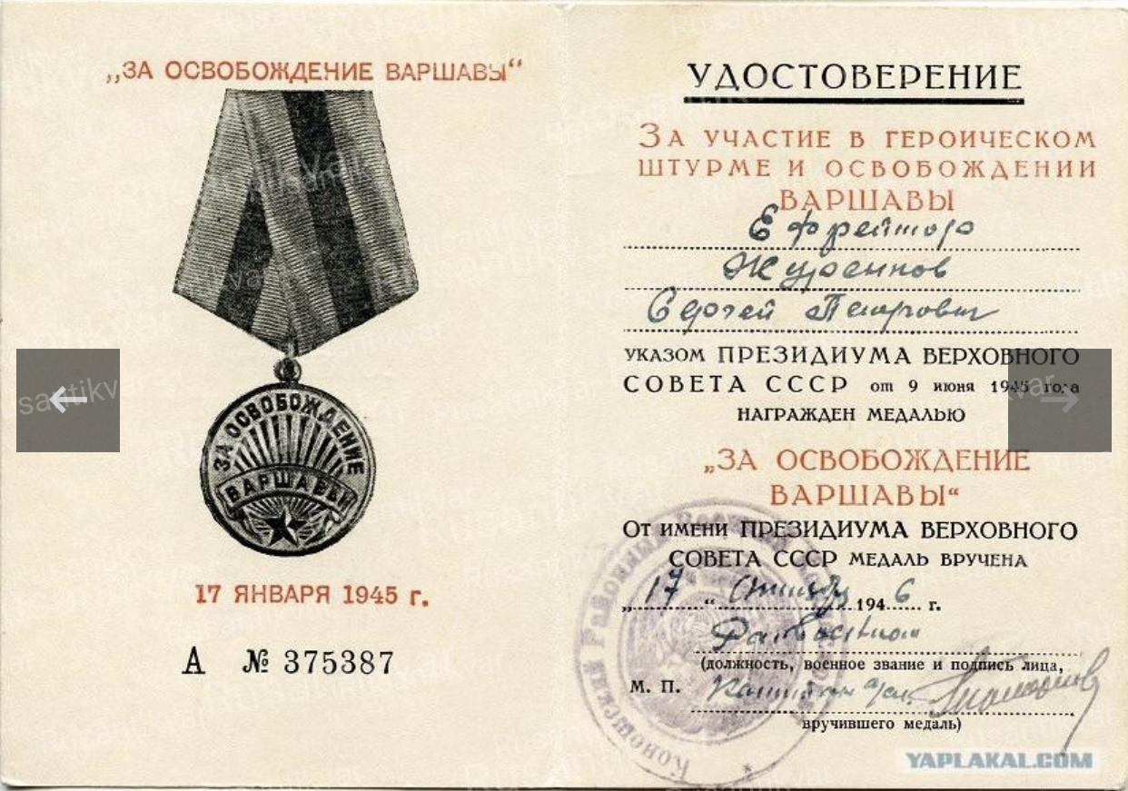 9. Удостоверение к медали «За освобождение Варшавы»;