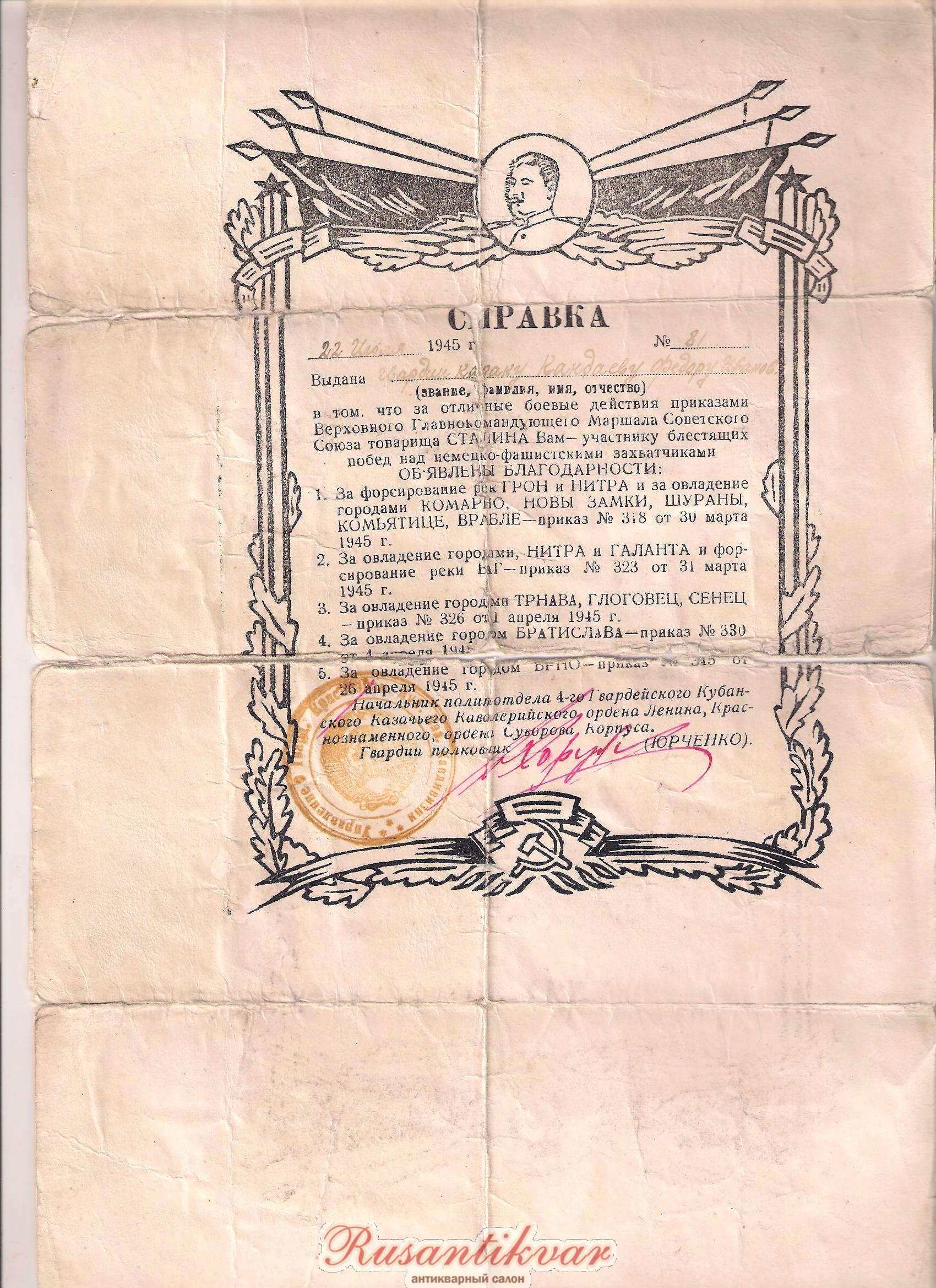 Справка гвардии казаку 4-го Гвардейского Кубанского казачьего кав.корпуса.