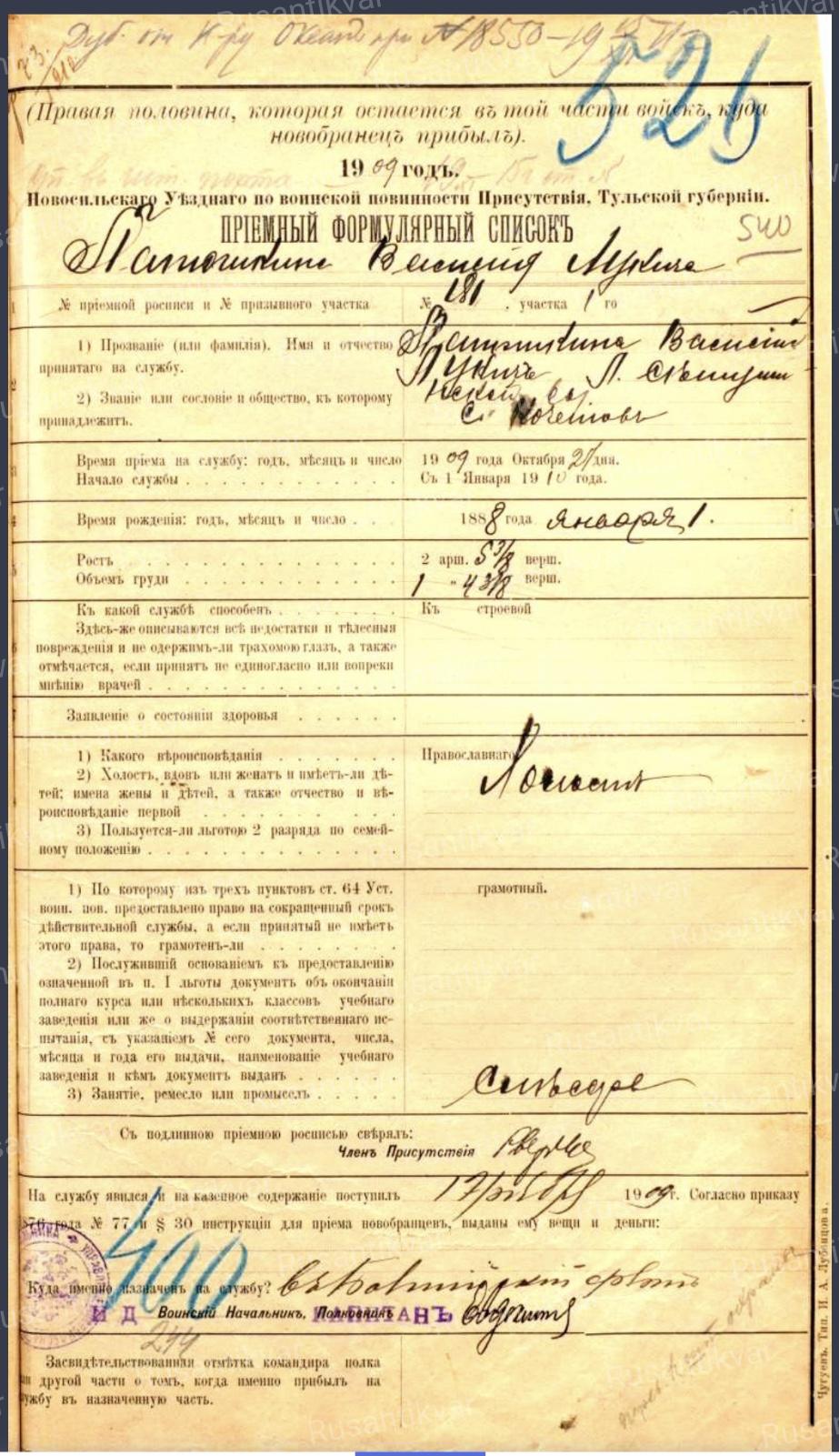 К этому времени из ФГУП РГАВМФ автор получил документы на Василия Панюшкина (исх. № 570-з от 12.04 2021 г. и № 840-з от 04.06.2021 г.). В них в частности сообщалось, что в Новосильском Уездном по воинской повинности Присутствии Василий, мечтая о море, пожелал служить на флоте. Поскольку флот являлся наиболее технически оснащенным видом вооруженных сил, то его комплектование производилось за счет грамотных и, имеющих соответствующую специальность, призывников. Призывная комиссия охотно исполнила его желание, тем более, что юноша при росте 2 аршина 5 3/8 вершка, по состояния здоровью, по всем статьям, подходил для флотской службы. Возможно, сказал свое веское слово и М. С. Сухотин.