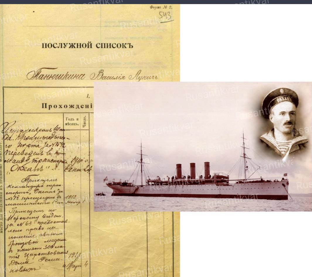 В соответствие с приказом командира транспорта «Океан» № 1 от 1 января 1913 года В. Панюшкин был произведен в машинисты 1-й статьи (Послужной список. Панюшкина Василия Лукича. РГАВМФ. Л. 543).