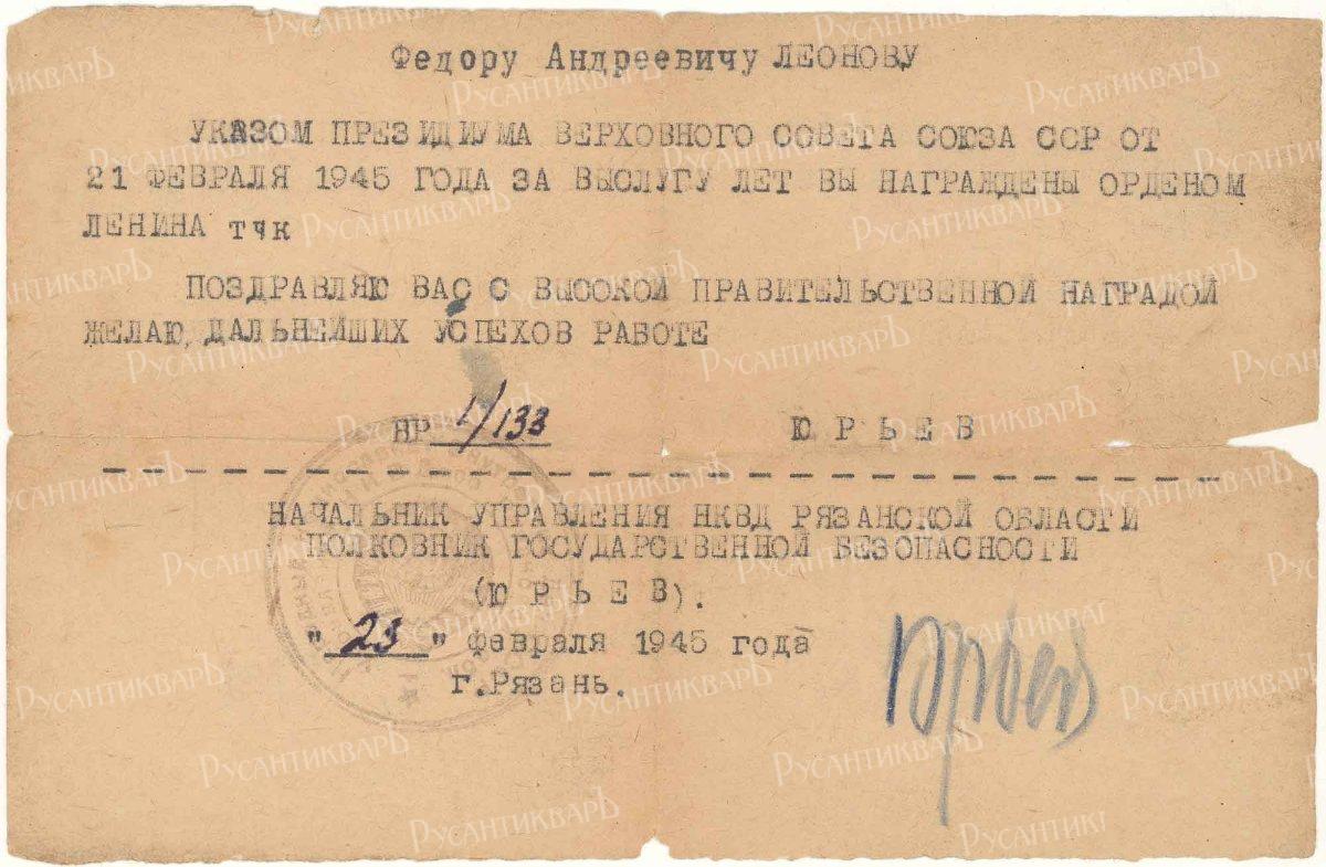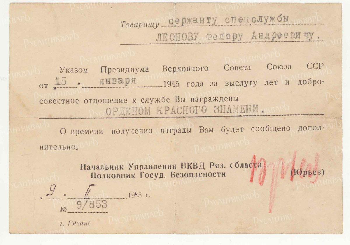 Интересные документы на сержанта спецслужбы, это звание приравнивалось к лейтенанту в Советской армии.Так для органов госбезопасности существовали специальные звания которые соответствовали армейским только на две ступени выше.такой порядок просуществовал до 6 июля 1945 года. Тогда начальствующему составу органов Народного Комиссариата Внутренних Дел и Народного Комиссариата Государственной Безопасности СССР присвоены воинские звания, установленные для офицерского состава и генералов Красной Армии.