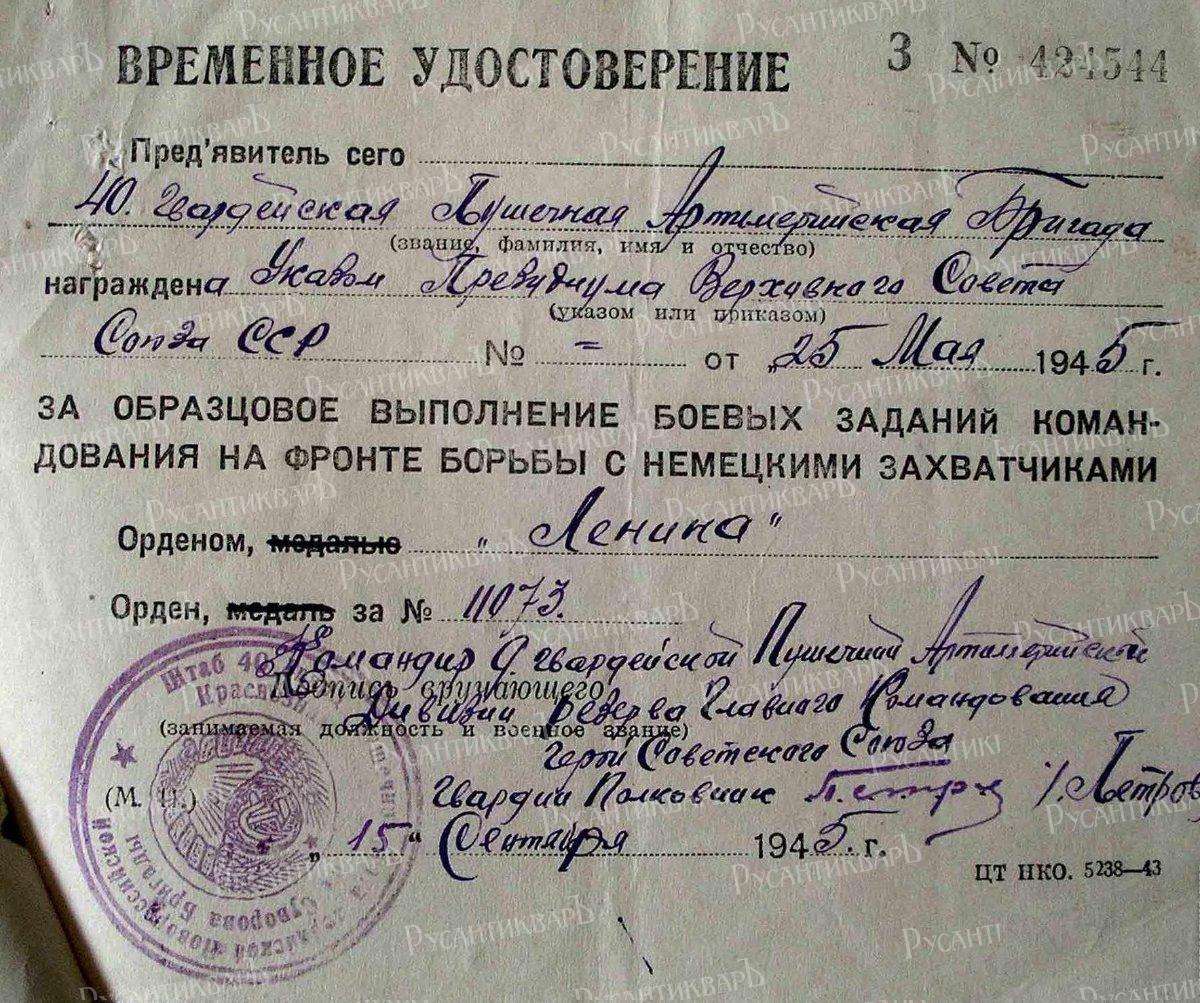 Временное удостоверения на Пушечную Артиллерийскую Бригаду.