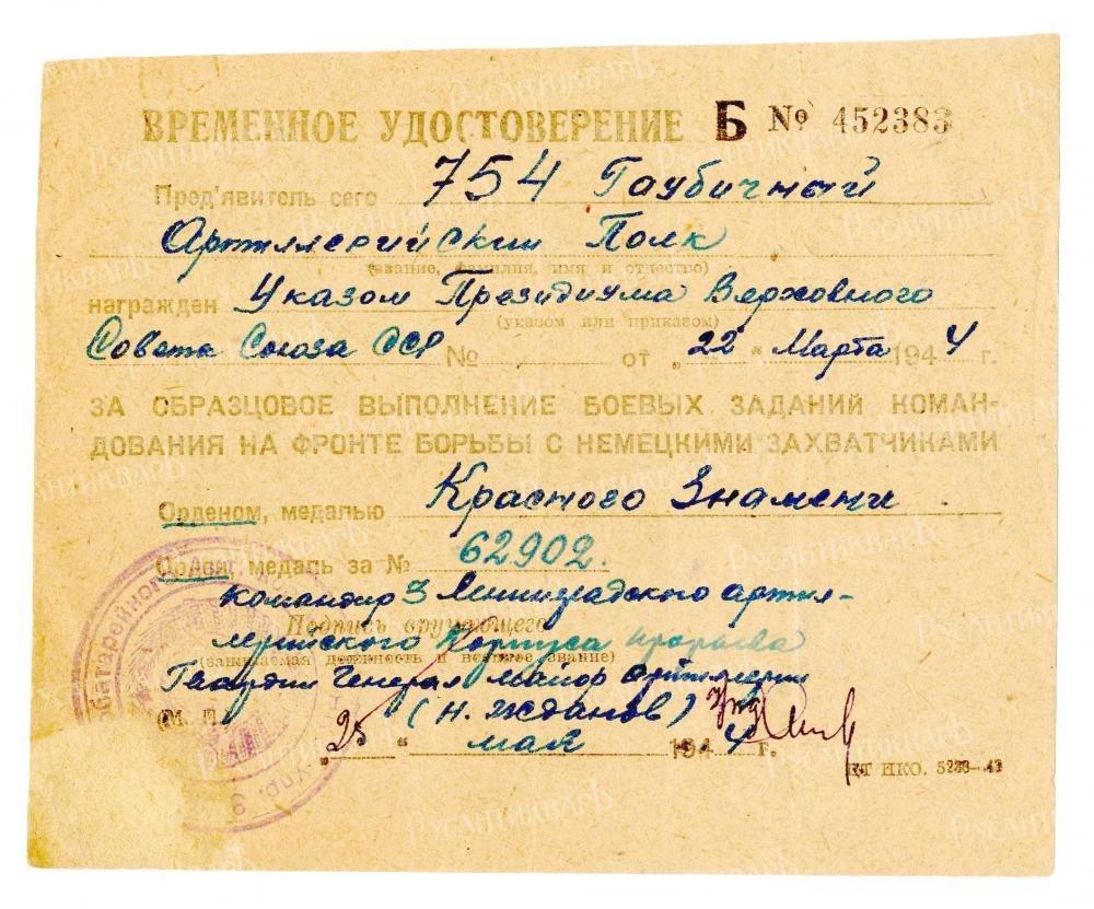 Временное удостоверения на Гаубичный Артиллерийский полк.