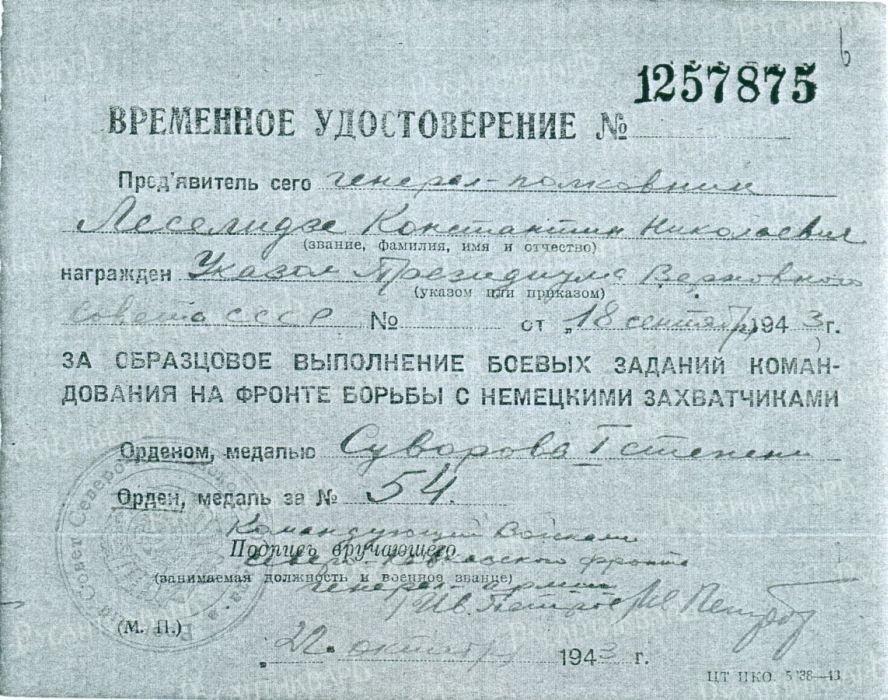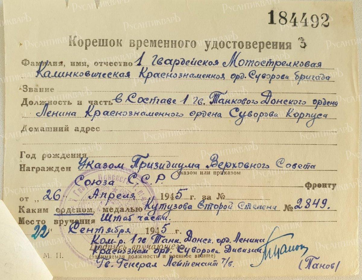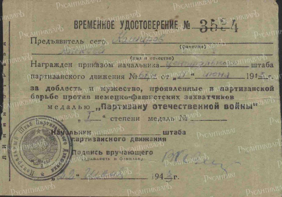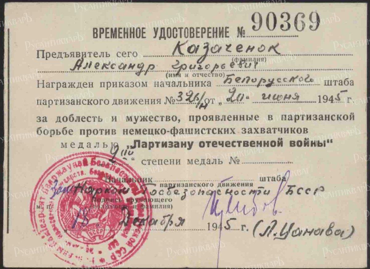 Временное удостоверения на медаль Партизану Отечественной Войны.