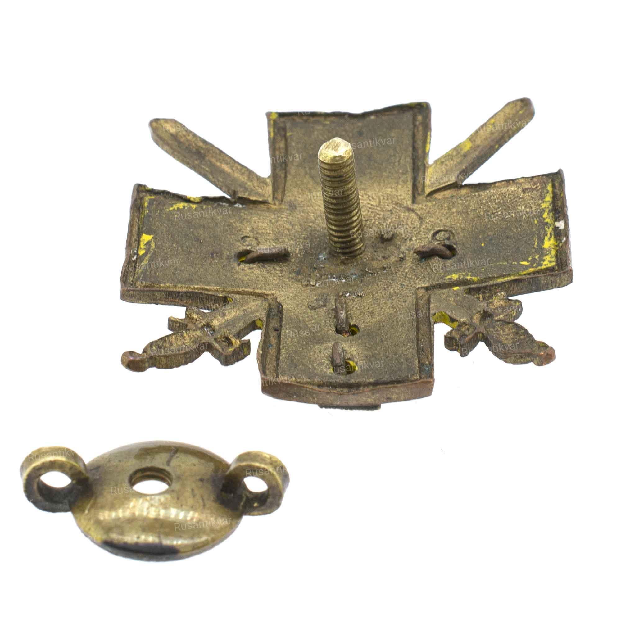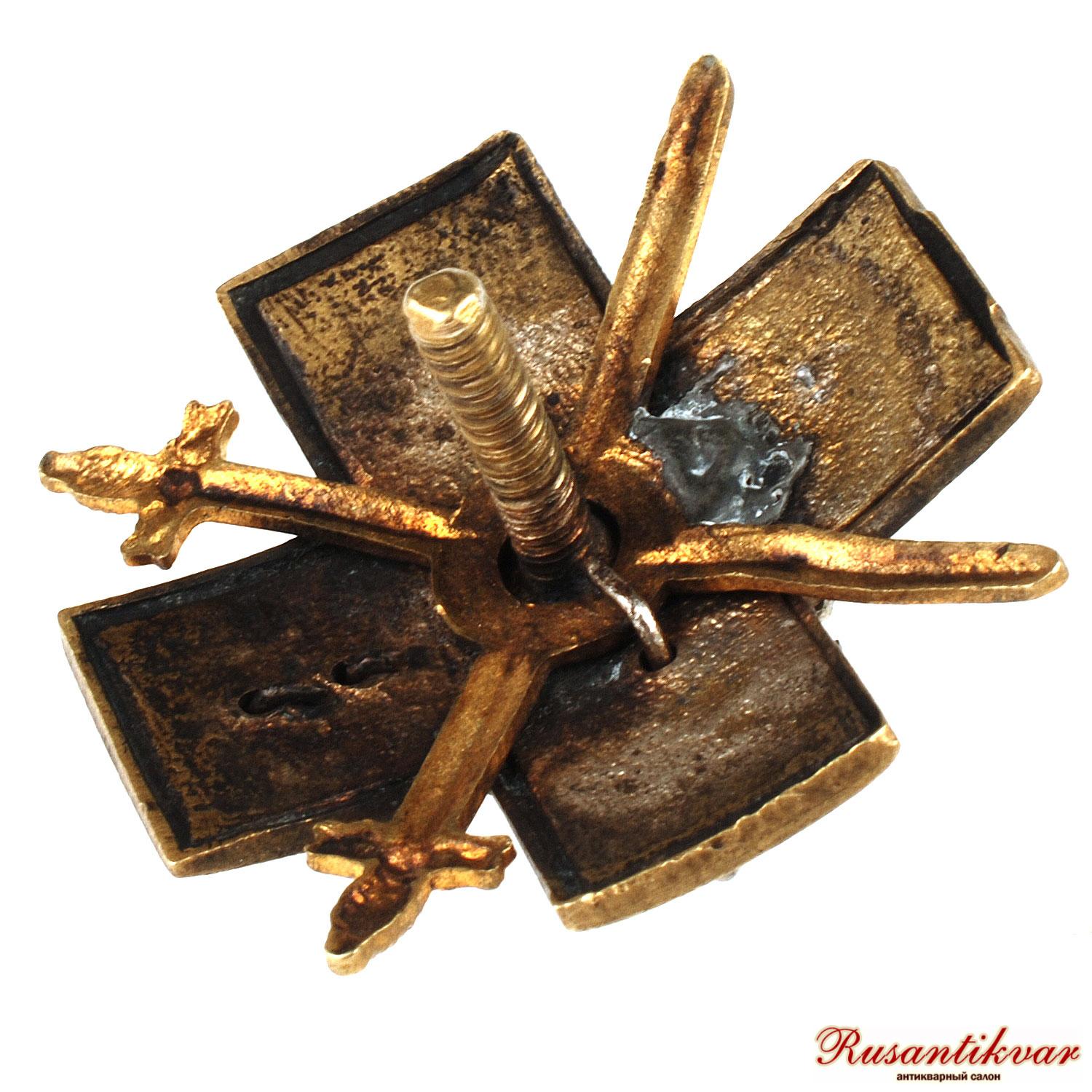 Российская Империя, 1914–1917 гг. Неизвестная мастерская. Бронза, серебрение, позолота, эмаль, 21.34 гр. Размеры 48.0 × 39.13 мм. Сохранность очень хорошая (XF). Патрикеев, Бойнович. т 1, № 1.7.8. Довольно редкий (Р).