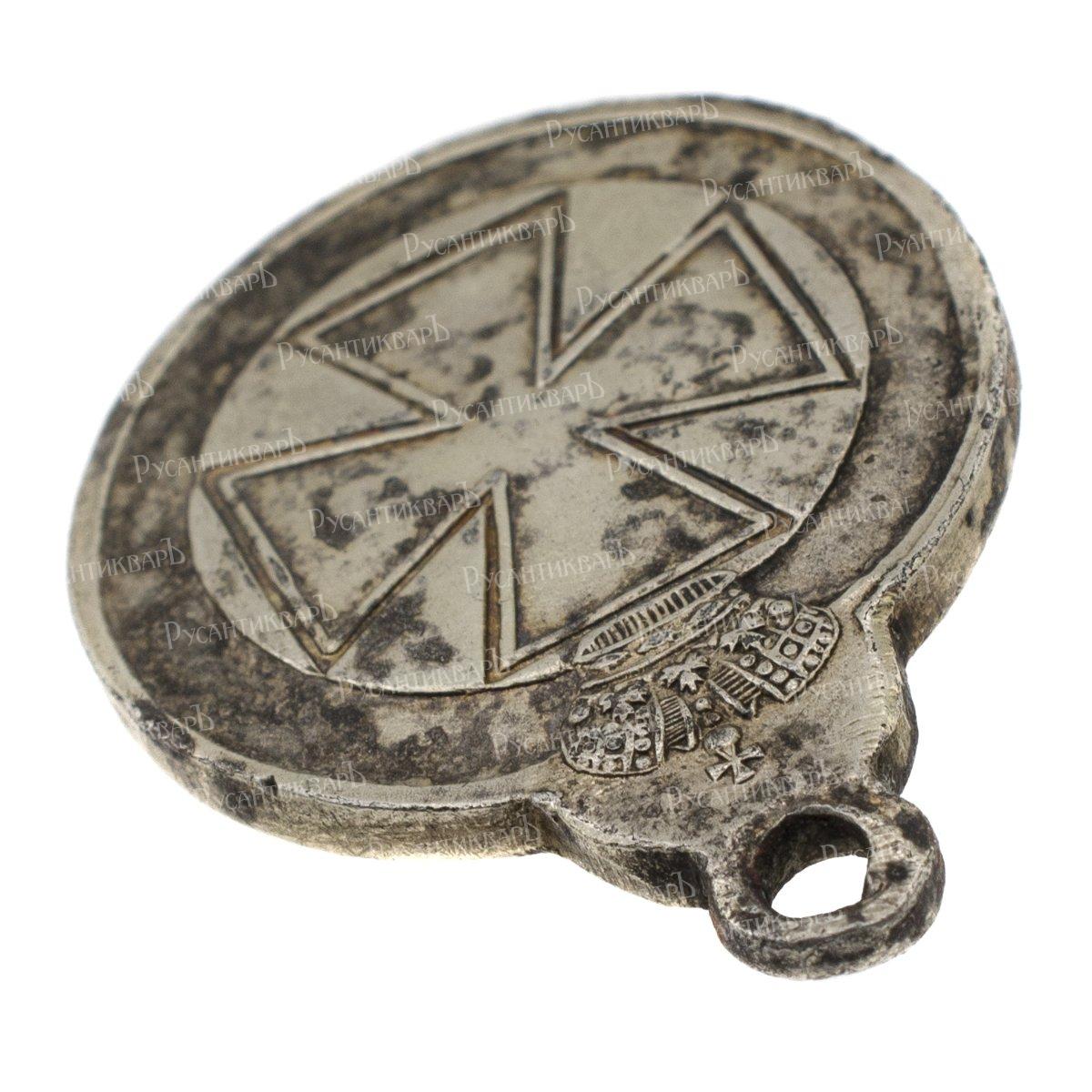 Закреплён в Статуте (учреждён) 5 апреля 1797 г Императором Павлом I (6 ноября 1796 г - 12 марта 1801 г). СПб Монетный двор, вторая четверть XIX в, во время правления Императора Николая I (19 ноября 1825 г - 18 февраля 1855 г). Серебро 72 пробы, вес 9.75 гр, толщина 2.42 мм, размер 30.93 х 23.53 мм, ухо 5.95 мм, корона 9.29 мм. Сохранность очень хорошая, мастика и позолота утрачены (ХF). На оборотной стороне выбит номер "322.337". В. В. Биткин "Сводный каталог медалей России" т. 2, № 727.2 (R). Довольно редкий (Р). Во время царствования Императора Николая I было выдано более 300.000 знаков. До 1889 г, после смерти награждённых, знаки сдавались в орденский Капитул. После отметки в реестре - передавались на Монетный двор для переплавки.