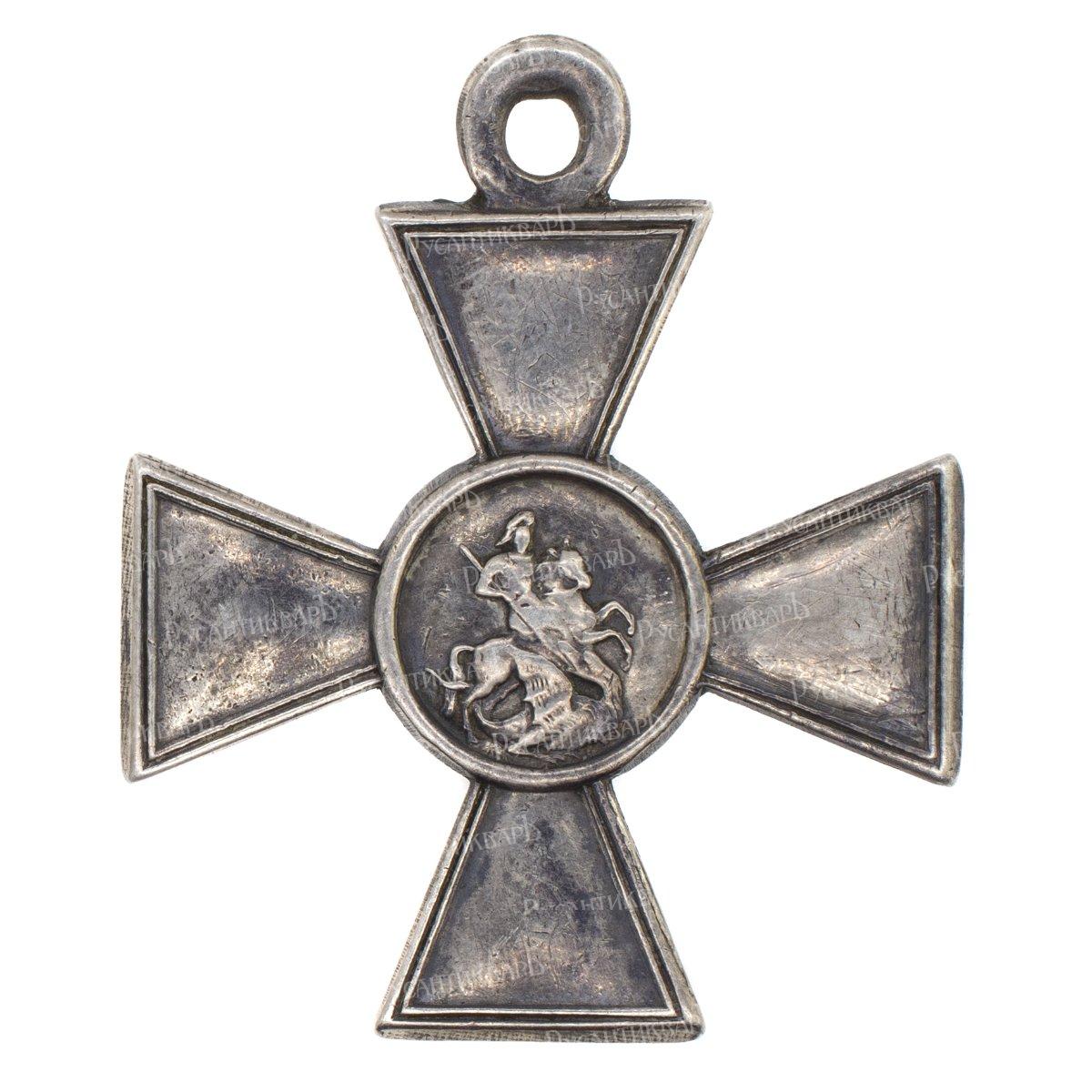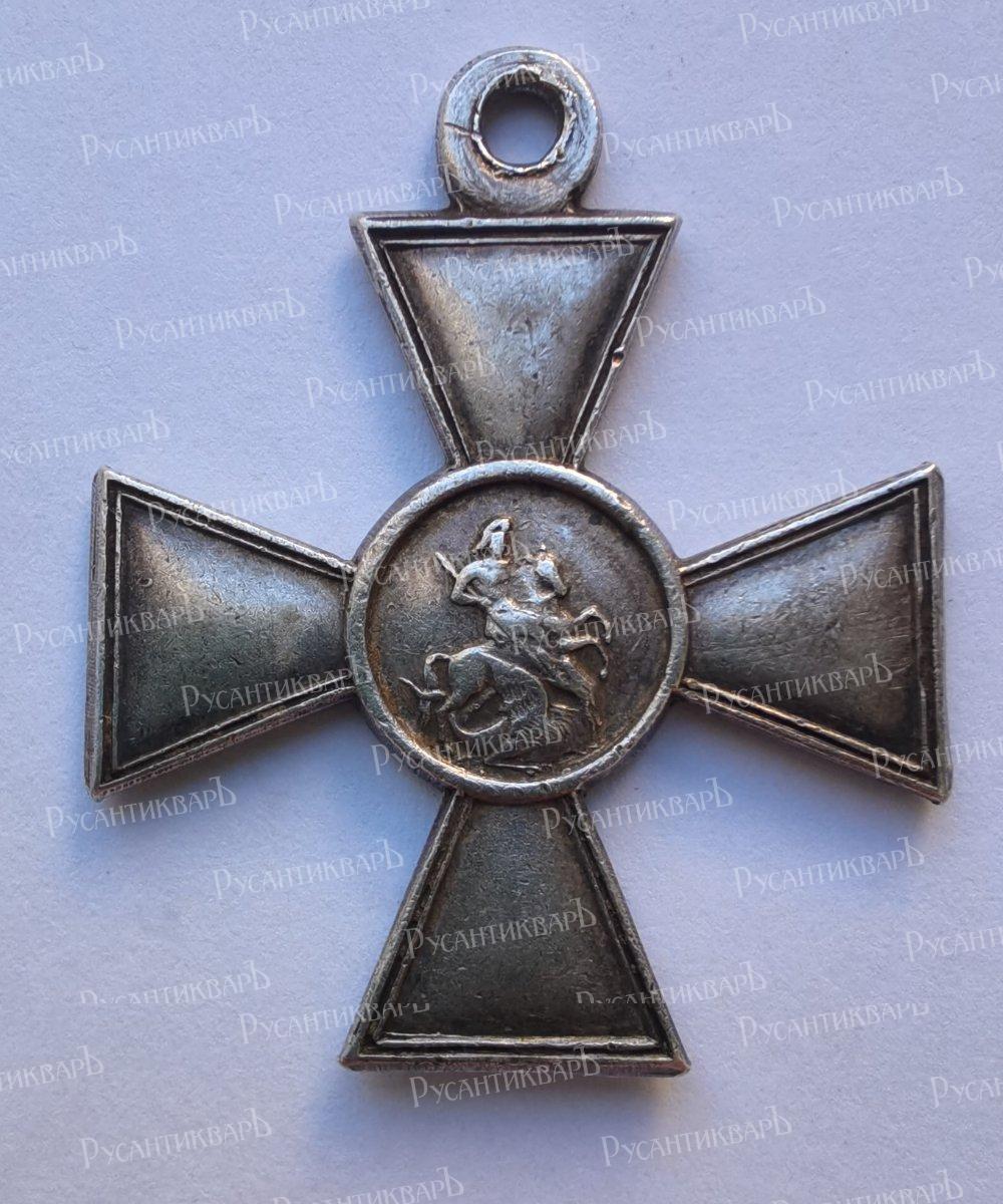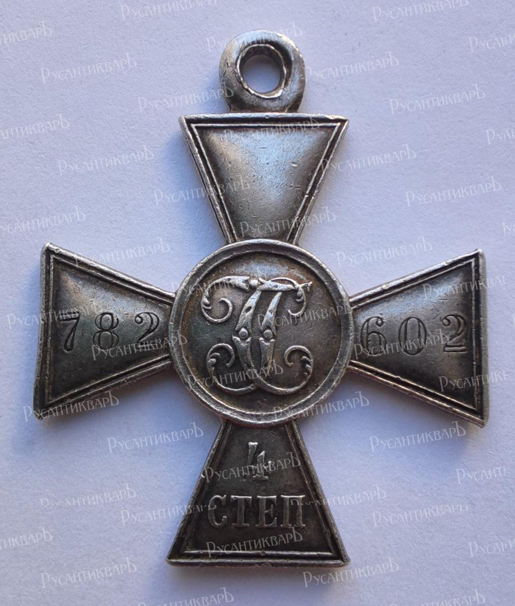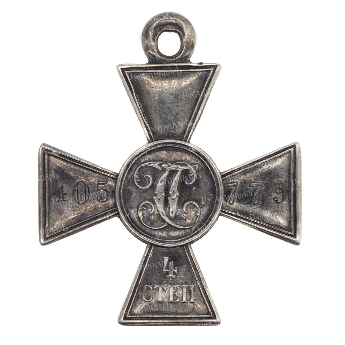 Учреждён 13 февраля 1807 г в период царствования Императора Александра I (12 марта 1801 - 19 ноября 1825 г) первоначально без степени и назывался Знаком Отличия Военного ордена (ЗОВО). Медальер - Авраам Авенирович Грилихес (1849 - 1912 гг). Петроградский Монетный двор, 1915 г Серебро, 99", 10.6 гр. Размеры 41.7 х 34.3 мм. На оборотной стороне пуансоном выбито " 405.779". Сохранность очень хорошая (XF). М. Е. Дьяков "Медали Российской Империи" № 1132.8 (R1). В. В. Биткин "Сводный каталог медалей России. Наградные медали для ношения" т. 2, № 1099.6. За период с 1 января 1914 по 1 января 1917 гг Георгиевских Крестов 4 ст было изготовлено 1.190.150 шт (№ 1 - № 1.210.150). Несоответствие количества объясняется использованием крестов из старых запасов - невручённых ЗОВО (перерезанные номера).