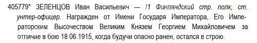 Георгиевским Крестом 4 ст с номером 405.779 награжден ЗЕЛЕНЦОВ Иван Васильевич — 11 Финляндский стр. полк, ст. унтер-офицер. Награжден от Имени Государя Императора. Его Императорским Высочеством Великим Князем Георгием Михайловичем за отличие в бою 18 06.1915, когда будучи опасно ранен, остался в строю.